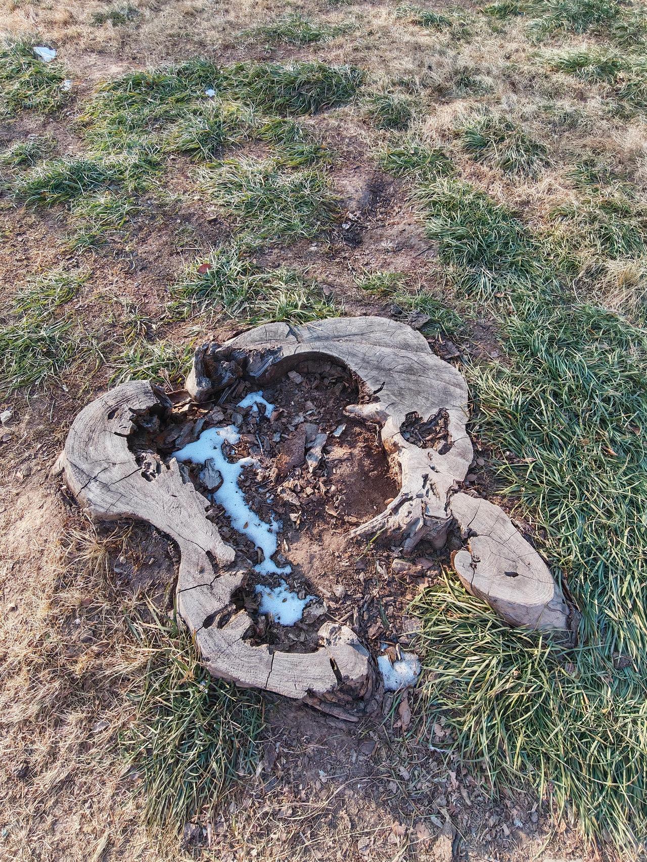 枯树遗桩,是岁月在大地写下的注脚。圈圈纹理,刻着风干的年轮,藏着无人知晓的往事。曾经,它也是枝繁叶茂的存在,鸟儿在枝头筑巢,蝉鸣在树梢喧闹。每一圈年轮都浸润着生长的喧嚣与活力。如今,树身虽已朽去,遗桩却倔强地守在原地,残存的积雪也选择在此驻足,为这沧桑添一抹静谧。它不再生长,却以另一种姿态,成为时光的见证者,向世界诉说着曾经的繁盛,和岁月流转中无法磨灭的生命印记。