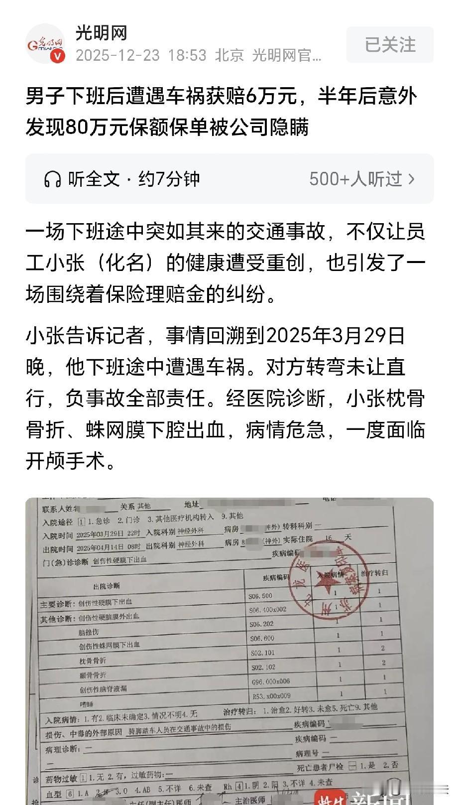 吃相太难看!江苏苏州,一男子下班被车撞了,对方全责,公司给他买了保险,立刻给他支付了60000元,男子签了协议,配合公司申请理赔,理赔款打给公司,盈亏和男子无关,谁知半年以后,男子意外发现,公司买的不是雇主责任险,而是团体意外伤害险,保额80万,受益人是男子,男子找老板质问,老板要他归还6万,并支付资金占用费500元,要他自己找保险理赔,男子为早点拿到保费,又和公司签了协议:不得向公司或第三方要求赔偿,之后,男子拿到赔偿款155400元,男子反悔,他又要申请工伤理赔,公司: 这是违约,如果再闹,就去告你! 2025年3月29日晚上,小张下班时被一辆车给撞了,肇事方因为转弯没让直行,被定了全责。 小张被送到了医院,被诊断为枕骨骨折,合并蛛网膜下腔出血,医生考虑要给小张做开颅手术。 小张害怕了,他记得公司曾经说过,给他买过一份保险,每个月的工资也被扣保险费用。 可公司冷漠,没一个人来医院看他,公司告诉他说,现在公司不忙,你养好伤不用回来上班了。 小张自行联系了保险业务员,他想问一下保险单号,更想了解一下赔偿的条款。 可保险员却说,他是和公司签的,不方便给小张多说。 小张有些担心,他直接找到老板,老板这才说了实话,公司给小张买的并不是人身意外险,而是雇主责任险。 老板让他不要去做伤残鉴定,一旦做了,小张就会成了残疾人,他的将来会受到影响。 老板又说,之前公司有位员工手指头断了两根,也才赔了60000元。 如果小张想快点拿钱,就要和公司签个协议,只要小张不去做鉴定,公司立刻给他支付10000元。 等到次月,再给他50000元就算补齐。 2025年4月25日,小张和公司签了《一次赔偿协议书》公司支付给小张60000元整。 这其中包括有工伤残疾补助、就业补助、医疗费、误工费等一切赔偿。 协议要求,小张要配合公司申请工伤认定和劳动能力鉴定,如果达到9级或者以上,公司就给他再补10000元。 如果鉴定为10级或没级别,公司不再另付赔偿。 小张稀里糊涂,这些专业术语,他如同在看天书,他签下了字,可他没有想到,协议里还有一份委托代领理赔款授权书文件。 文件上面写到,小张配合公司向保险公司申请理赔,所有理赔款直接打进公司账户,盈亏与小张无关。 半年之后,签完协议,小张身体渐渐恢复, 公司要求,让他去做劳动能力鉴定。 可小张在鉴定时,看见了自己那份保险单名称。 他这才知道,公司买的不是雇主责任险,而是团体意外伤害险。 保单上写着,被保险人是小张自己,保额高达800000元,受益人是小张自己! 小张这才明白,是公司想把理赔款领走,自始至终都在欺瞒自己。 2025年10月31日,小张去找保险业务员,可对方把他拉黑。 小张又找老板,老板表示,所有保险只能赔付一次。 之前公司已经支付给了小张60000元,老板要他把钱退回来,要他自己去找保险公司理赔。 小张找到鉴定部门,他被告知,鉴定报告已经被保险员取走,已经向保险公司提交了理赔申请。 小张立刻叫停了理赔程序,保险公司告诉他说,对他的事故核定赔偿额为161600元。 可老板却告诉小张,如果小张不肯配合,这笔钱就休想拿到! 公司承认买了意外险,但要求小张再签一份补充协议。 协议里约定,小张拿到理赔款后,必须当天返还公司给他的61200元。 另外,小张还必须给公司支付5000元资金占用费,以后不能再向公司或任何第3方主张赔偿。 2025年12月2日,小张签了字,他向公司打了张66200元的欠条。 3天后公司通知小张到了保险公司。 经现场核定,小张的保险理赔总额为161,600元,公司减去66200元,剩余95,400元打给小张。 如此一来,小张共收到155400元赔偿金。 可是小张认为,他是被逼无奈,才在当时签下了文件。 如今他想要另行申请工伤赔偿,于是再次向保险公司申请撤销了理赔流程。 16.16万元的理赔款被冻结在保险公司,双方无法协商一致。 公司认为,小张签协议都是自愿,如今就是反悔,公司已经履行了付款义务。 公司买保险本是为了降低风险,协议里写得明白,所有纠纷一次了结。 如果不走保险,公司不会赔这么多钱,如果小张继续追究,公司将会告他违约,还会追讨律师费与违约金。 但小张不再示弱,他找律师咨询,以日薪240元计算,加上伤情,工伤赔偿应该有16万。 小张想拿回保险赔偿款,也想再拿会公司赔偿金,他要通过法律维权。 《民法典》第148条规定: 一方以欺z手段使对方在违背真实意思的情况下实施的民事法律行为,受欺z方有权请求撤销。 公司y瞒团体意外险真相,使小张签订放弃权利的协议,属于欺z行为。 团体意外险理赔与工伤赔偿互不冲突,小张有权申请撤销协议,并依法主张工伤赔偿。 关注@王哥说法