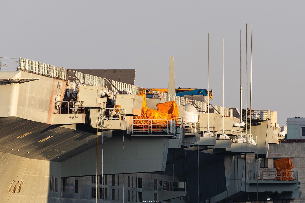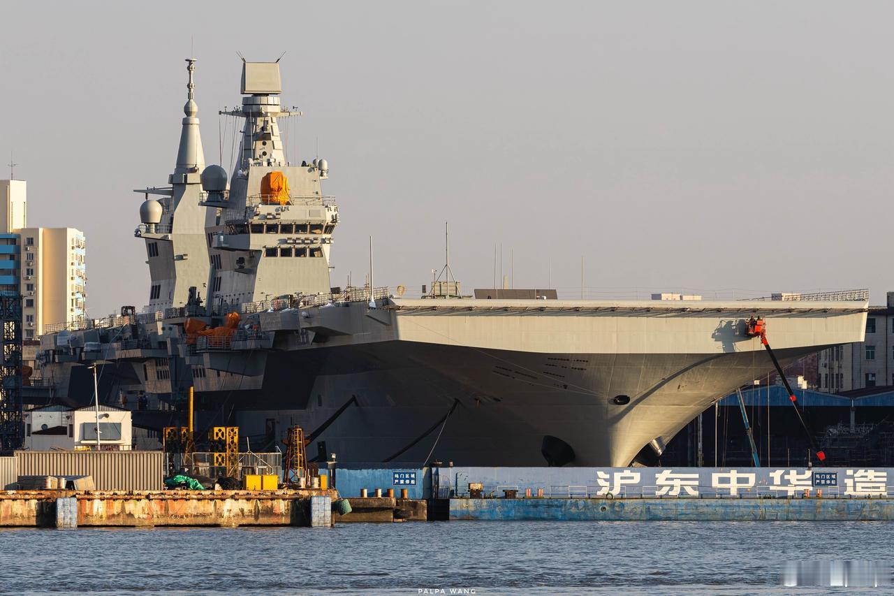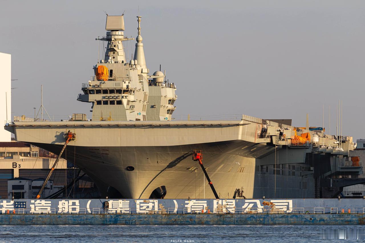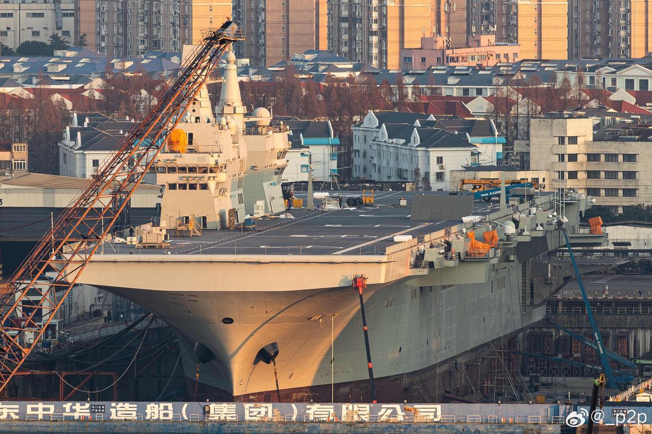 甲板好似在准备重新画线,为076型下次海试无人战机CCA上舰测试做铺垫;076型两栖攻击舰四川号停靠沪东船坞的高清(4K)美图。