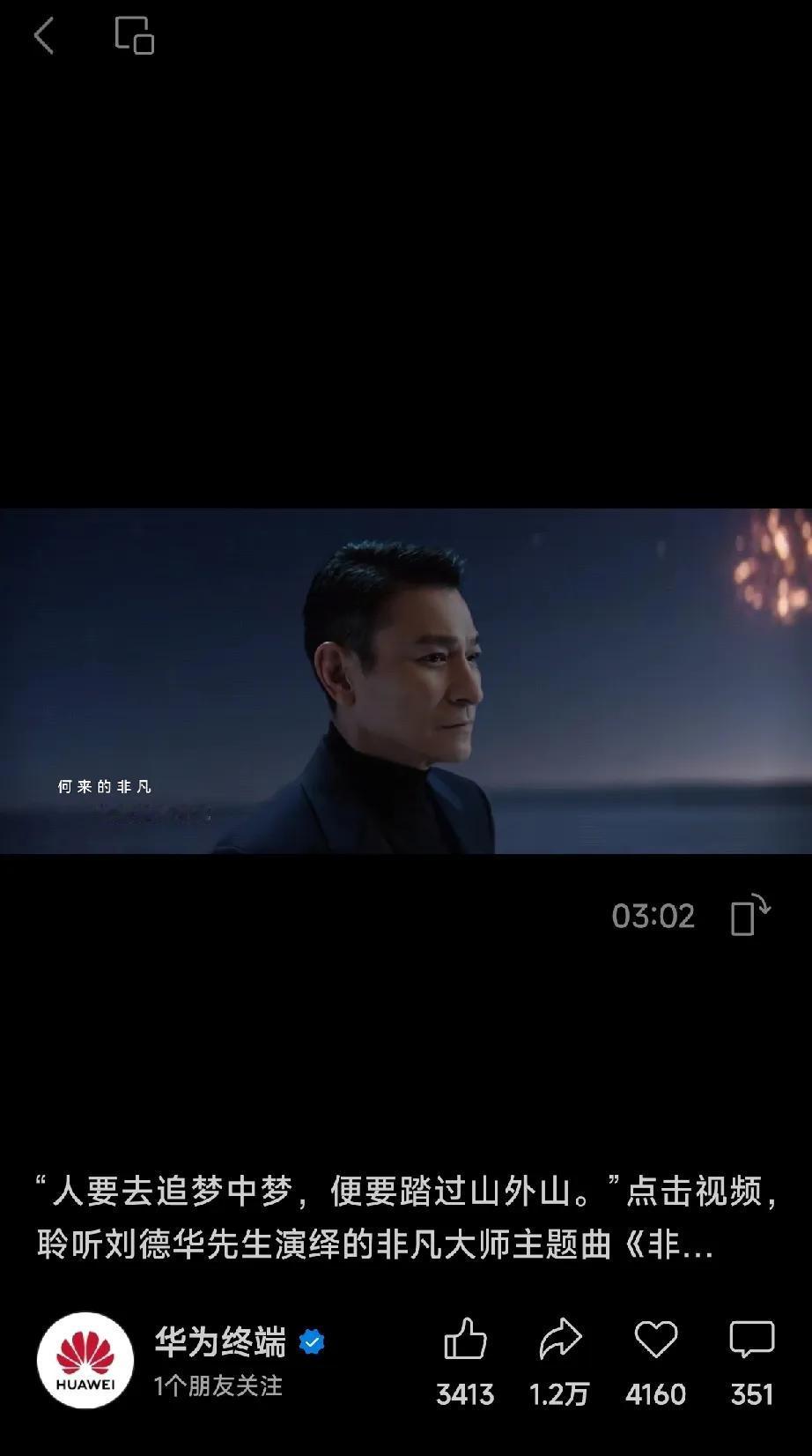 人要去追梦中梦 便要踏过山外山,刘德华为华为演绎了一首[非凡],在今日发布,震撼了世界多数华人! 虽然刘德华有其他合约在身,无法代言有华为赋能的汽车品牌,但是一直以来,刘德华和华为的绑定,让大家感觉到他代言了包括手机和所有业务在内的非凡精神! 说到这里,有网友突发奇想说——华为余承东代言着鸿蒙智行; 华为“二公主”姚安娜,七个月前成为阿维塔第1001号共创员工,这就意味着从某种意思上讲姚安娜她代言着阿维塔; 这么一看华为用对了有正能量的流量新星,如此说来如果让孟晚舟代言HI PULS模式的岚图、奕境、猛士会不会起到同样的网络流量?进入当今现代社会有流量就能确定一个品牌的正面走向。如果华为人都能在恰当的时候贡献自己流量,让其赋能品牌获得更多的关注,这也是一种合作共赢。 当然这只是一种空间想象的愿景,如有雷同事件发生,纯属偶然巧合![笑哭]