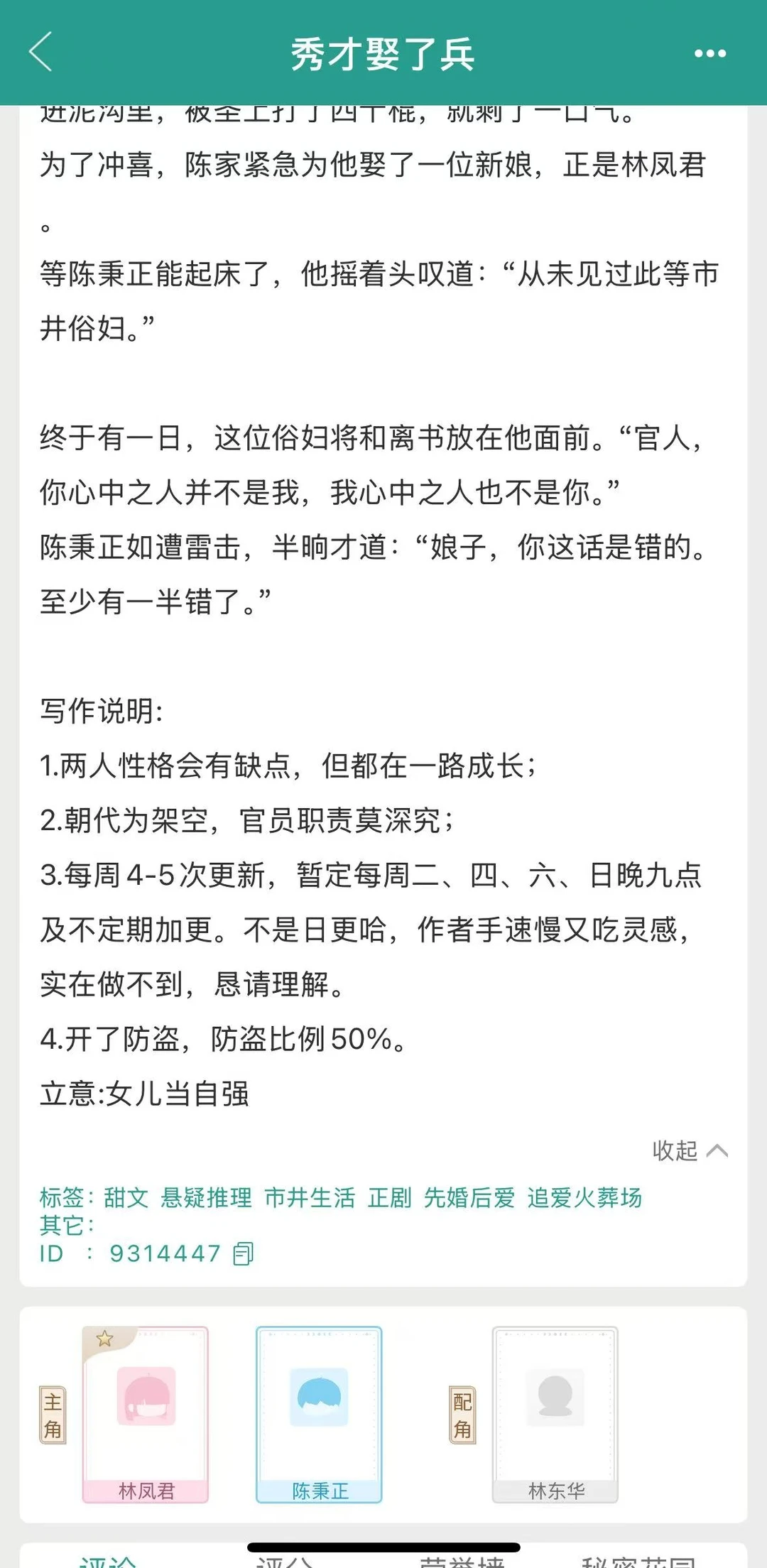 [樱花R]《秀才娶了兵》by梁芳庭 [樱花R]热忱务实 x 清正古板 [樱花R]古言/先婚后爱/江湖/悬疑/追妻 [种草R]作者大大的文笔很棒,对整个故事的把控很到位,整个的节奏很稳,叙事兼具市井烟火气和朝堂权谋紧张感,在政治权谋中融入主角的感情线,张弛有度的同时,又借主角的感情线来表达故事内核。 [种草R]整个故事用三条线进行并行叙事,一条是男女主的感情线,也是故事的主线,两人感情的变化,从嫌弃、试探、和离、追爱,再到双向奔赴。 [种草R]一条是悬疑探案线,从地方凶案到贪腐案,再到朝堂余孽追杀,用案件让男女主能力互补、信任升级,为感情提供试炼场。 [种草R]还有一条是男女主的成长线。女主从率直的江湖镖师到能掌家、能断案的成熟女性转变;男主从清高文官,再到懂烟火、有温度的丈夫与能臣。 小说 小说推文 古言 古言权谋 完结小说推荐 先婚后爱