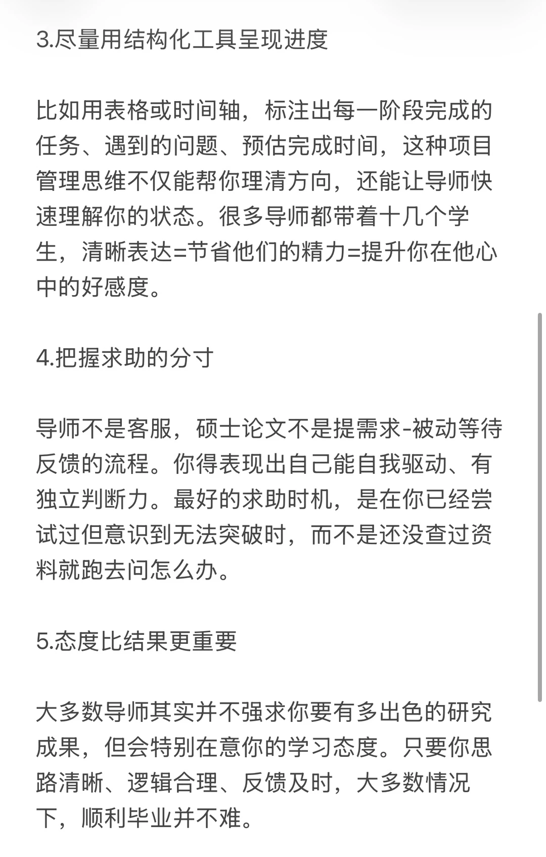 导师不是客服,硕士论文不是提需求-被动等待反馈的流程。你得表现出自己能自我驱动、有独立判断力。最好的求助时机,是在你已经尝试过但意识到无法突破时,而不是还没查过资料就跑去问怎么办。