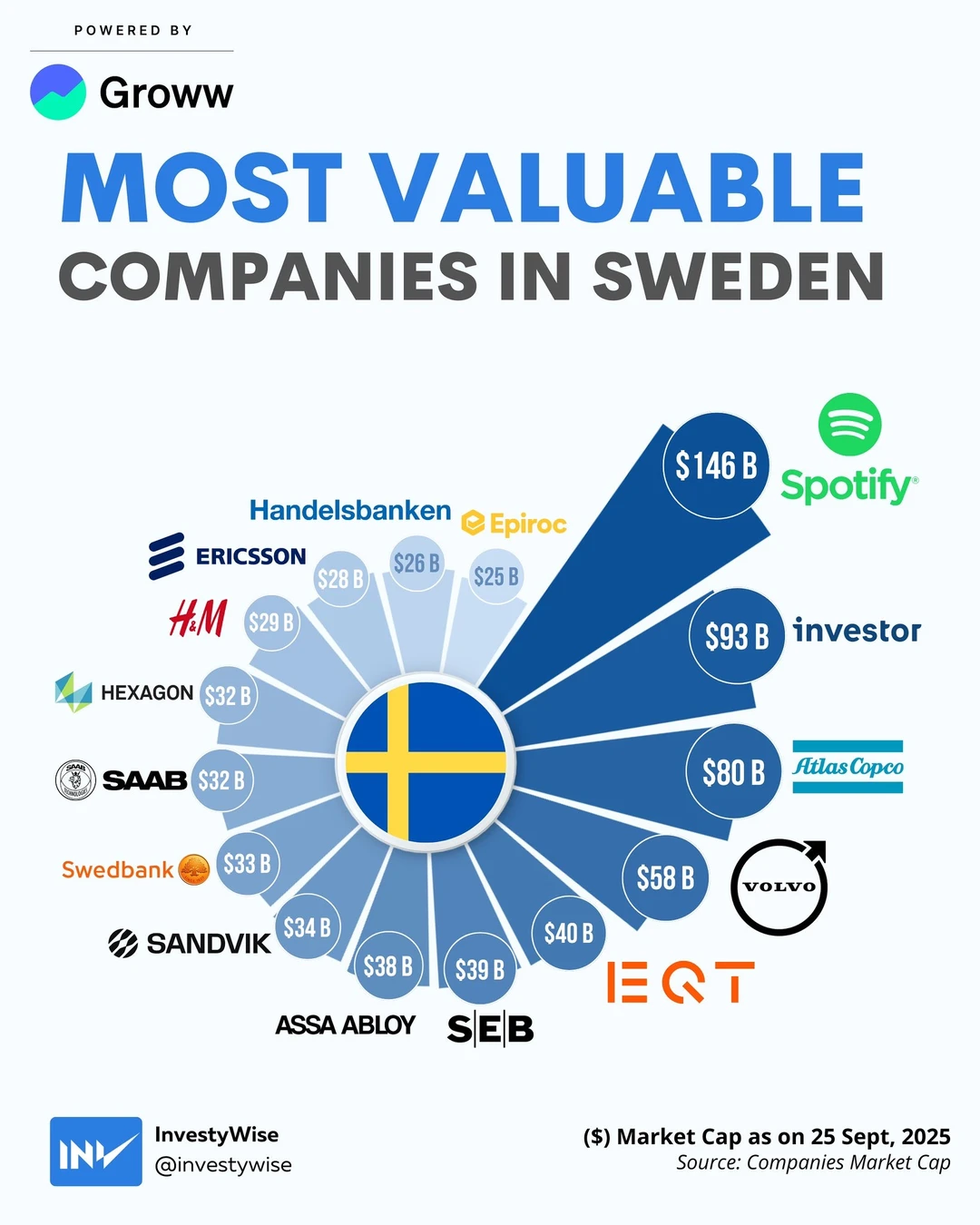 紧随其后的是 Investor,估值约 930亿美元。它并非单一业务公司,而是瑞典最重要的工业与金融控股平台之一,长期持有多家核心企业权益。Investor 背后是瑞典著名的瓦伦堡家族,其稳健、长期主义的资本运作风格,深刻影响了瑞典工业体系的百年发展。