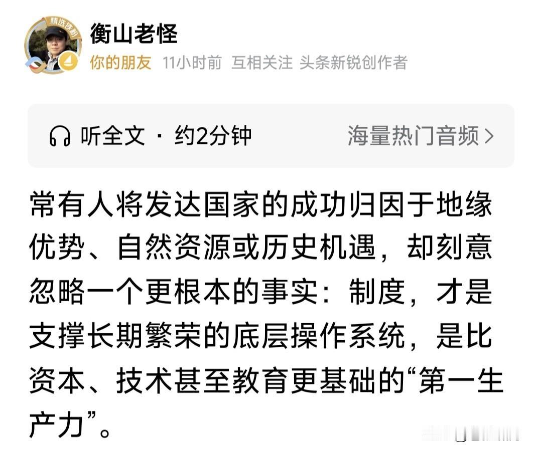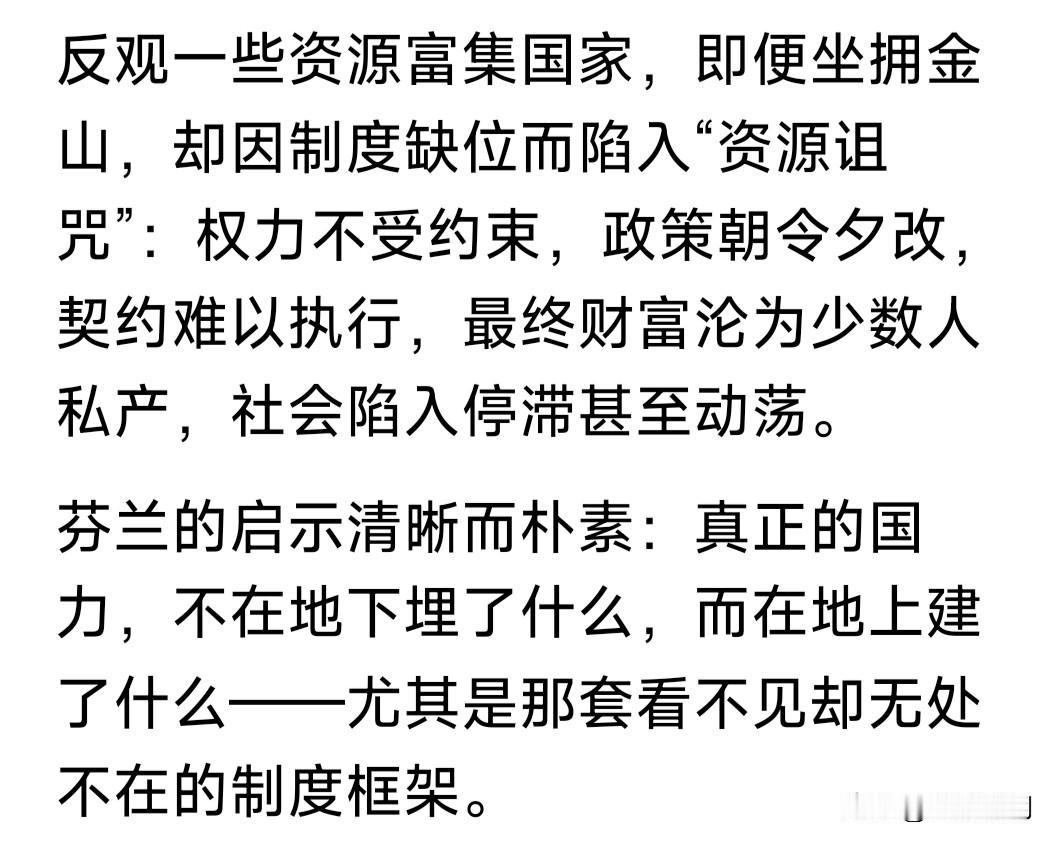 网友以芬兰为例,痛斥“发达国家/地缘/资源/机遇”论!刻意忽视了根本原因:制度设置与完善决定一切。 芬兰土地贫瘠也无资源,气候严寒人口稀少,地缘恶劣屡受欺辱。却在几十年间成为法治与创新标杆国家! 反观有些地缘优越资源丰富国家,没有建立法治体系,导致权力争夺倾轧,社会混乱不堪,一直成不了发达国家,甚至由富转贫。比如伊利南委。 网友举例的芬兰,为正面典型!伊利南委为反面典型。其实正面典型不仅是芬兰,北欧五国与波海三国,以色列都是的。尤其以色列最说明问题。 与以色列相反的,是中东大部分国家。中东除了沙特阿联酋卡塔尔科威特,靠卖资源富裕,但却成不了发达国家。而也门埃及黎巴嫩,以及非洲南美一些国家,资源丰富为什么贫穷呢? 网友提出这个问题,值得我们深思!中国经历改革开放,已进入依法治国持续发展快车道!坚定沿着这条路,义无反顾往前走,中国的未来无限美好!我们的日子定会芝麻开花节节高! …………