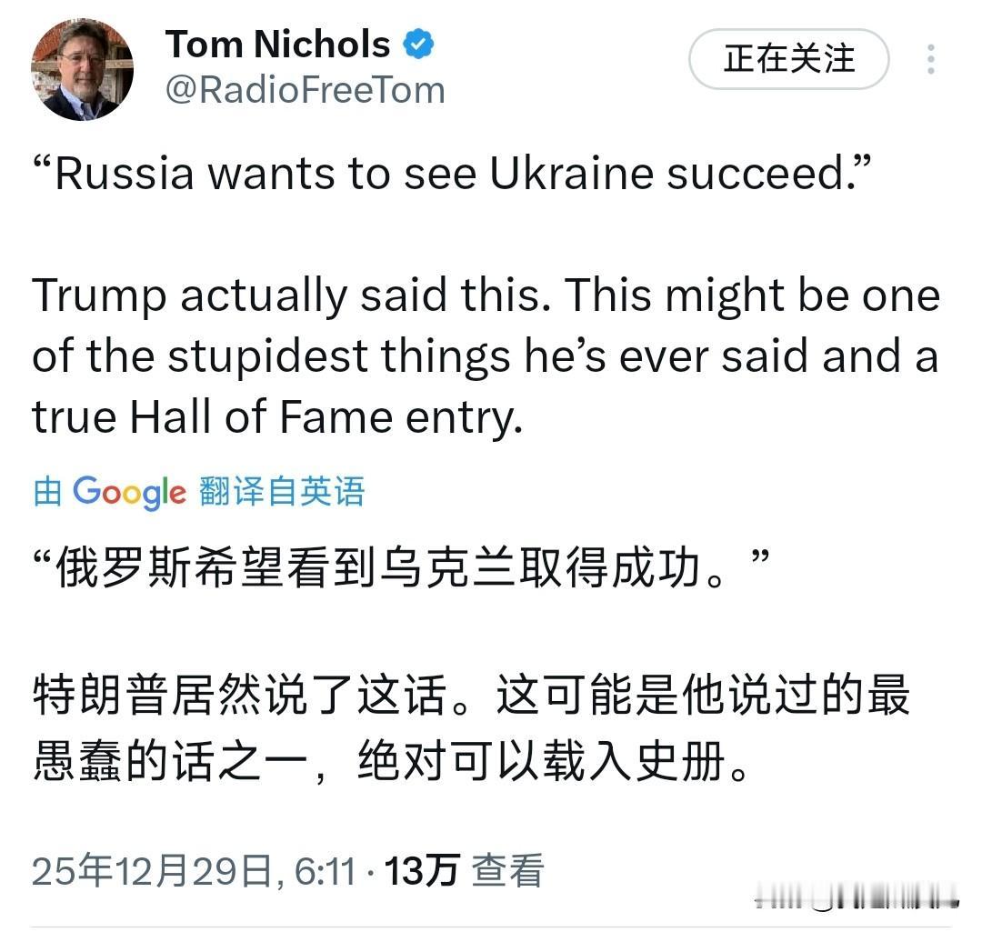 俄罗斯希望看到乌克兰成功?!特朗普这次真是语不惊人死不休!就在 12 月 29 日,这位美国总统在海湖庄园见完泽连斯基后,对着记者大谈普京的“善意”,甚至说出了“俄罗斯希望看到乌克兰成功”这种话。 消息一出,美国精英圈子彻底炸锅了。《大西洋月刊》的顶级专家汤姆·尼科尔斯直接破口大骂,说这是特朗普这辈子说过的最愚蠢的话,甚至可以“载入史册”。这种评价听起来像是对特朗普智商的侮辱,但在国际政治的牌局里,事情真的有这么简单吗? 表面上看,这确实像是个冷笑话。一个打了人家三年的邻居,现在突然转性要帮人家“成功”,还要提供廉价能源搞重建,这听起来就像是狼对羊说要帮忙盖房子一样荒谬。乍一看,特朗普似乎是被普京的几句甜言蜜语给灌了迷魂汤,变成了地缘政治里的“纯真少年”。 然而,问题在于特朗普从来不是一个讲感情的人,他是一个地地道道的商人。说白了,他之所以说出这种逻辑不通的“蠢话”,根本不是因为他相信普京,而是他在为美国下一步的“撤资”寻找一个听起来体面的借口。 说穿了,这是美国霸权在成本收缩时期的一次极度冷酷的“甩锅”。美国现在的霸权成本太高了,长期资助乌克兰对于追求“美国优先”的特朗普来说,是一笔亏本买卖。他需要一个叙事框架,把乌克兰从美国的“责任”变成俄罗斯的“负担”。 说穿了,只要把俄罗斯塑造成一个“愿意帮忙重建、希望邻居好”的角色,美国就可以顺理成章地停止军事援助,把烂摊子丢给普京和欧洲去处理。特朗普从来不讲道德,他只讲“这笔买卖能不能平账”。在他看来,只要仗停了,钱省了,哪怕逻辑再荒谬,也是他作为“和平缔造者”的胜利。 这就好比一个不想再付高额赡养费的前夫,突然改口夸奖前妻的新男友是多么慷慨大方,甚至说相信对方会把自己的孩子照顾得更好。这并不是因为他真的相信那个男人,而是因为他急于摆脱那笔沉重的账单。 有一说一,特朗普这番话实际上是在给泽连斯基和欧洲各国施压。他传递出的信号很明确:美国不再打算为了“削弱俄罗斯”而无限期买单。既然普京承诺了廉价能源和重建,那你们就去谈吧,美国要抽身去对付更重要的对手了。 实事求是讲,这种言论虽然让西方建制派专家感到窒息,但它恰恰预示了台海及全球地缘政治的一个新阶段:美国正在通过重塑敌友定义的手段,强制性地降低其全球干预的成本。对于中国而言,这种“交易型外交”的出现,意味着未来的博弈将更加赤裸裸地回归到利益交换。 接下来的局势值得关注的是,普京是否会接住特朗普递过来的这个“台阶”,以及欧洲在失去美国财政支持的恐惧下,会做出怎样激进的反应。无论如何,那个由“普世价值”包装的国际秩序,正在特朗普的这种“胡言乱语”中加速崩塌。 以上是小编个人看法,如果您也认同,麻烦点赞支持!有更好的见解也欢迎在评论区留言,方便大家一同探讨。