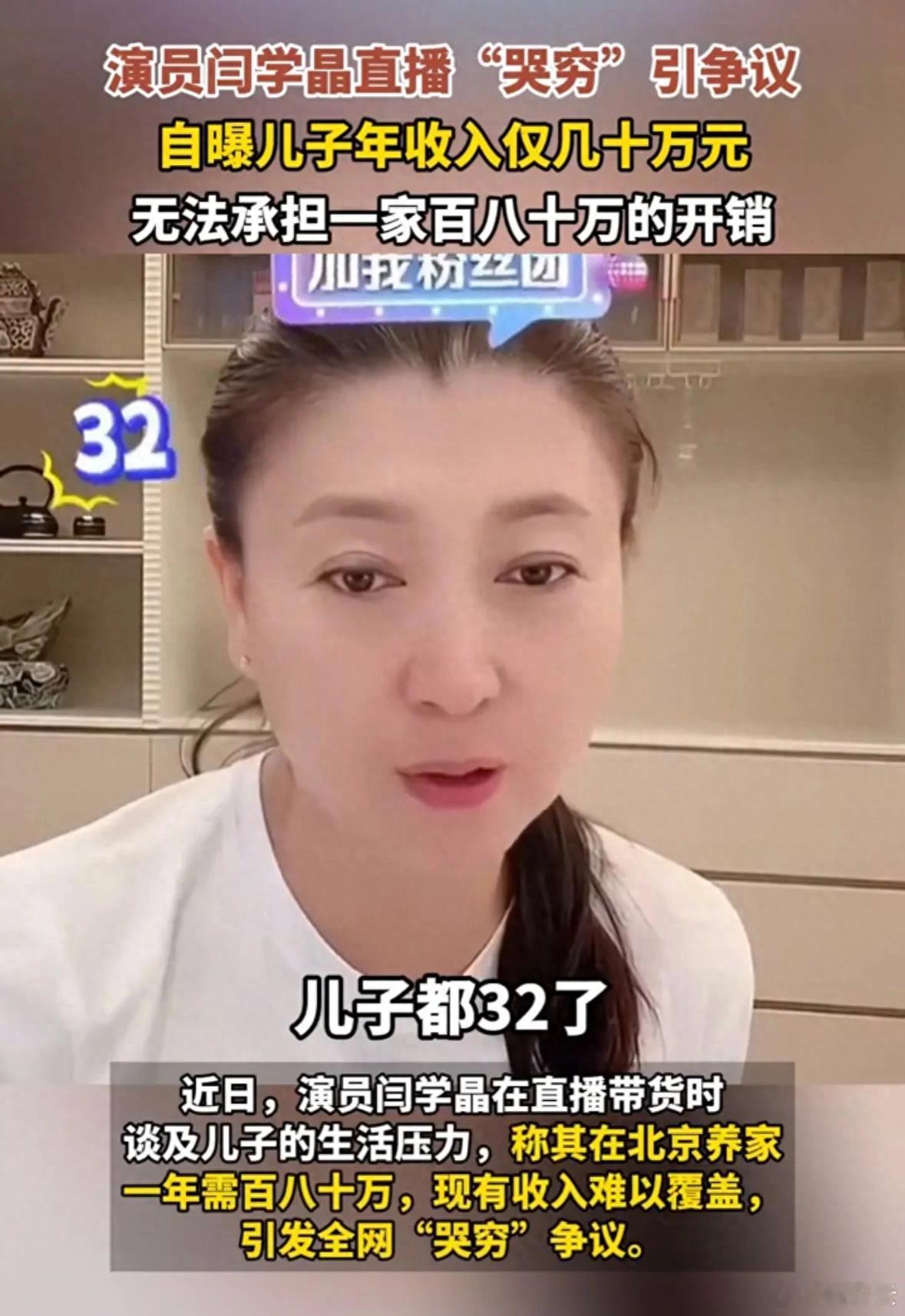 演员闫学晶哭穷引争议 近日,演员闫学晶在直播带货时谈及儿子的生活压力,称其在北京养家一年需百八十万,现有收入难以覆盖,引发全网“哭穷”争议。