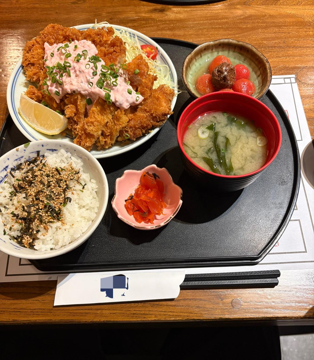 为什么老是说日本人的饮食很健康呢? 其实我觉得也分情况吧 比如说他们很喜欢吃炸猪排 咱们有些养生专家,不是说了油炸的东西吃了不好吗? 看这一份炸猪排, 配了一个米饭, 米饭上面还洒了一些紫菜芝麻粉, 吃起来很好吃,但是有点类似于鸡精,估计也有各种添加剂,不太健康。 那一碗味增汤,按咱们中国的标准来说,也是妥妥的预制汤,就是一点酱料加一点开水。 这一份快餐,按咱们的标准来讲,一点都不健康啊!