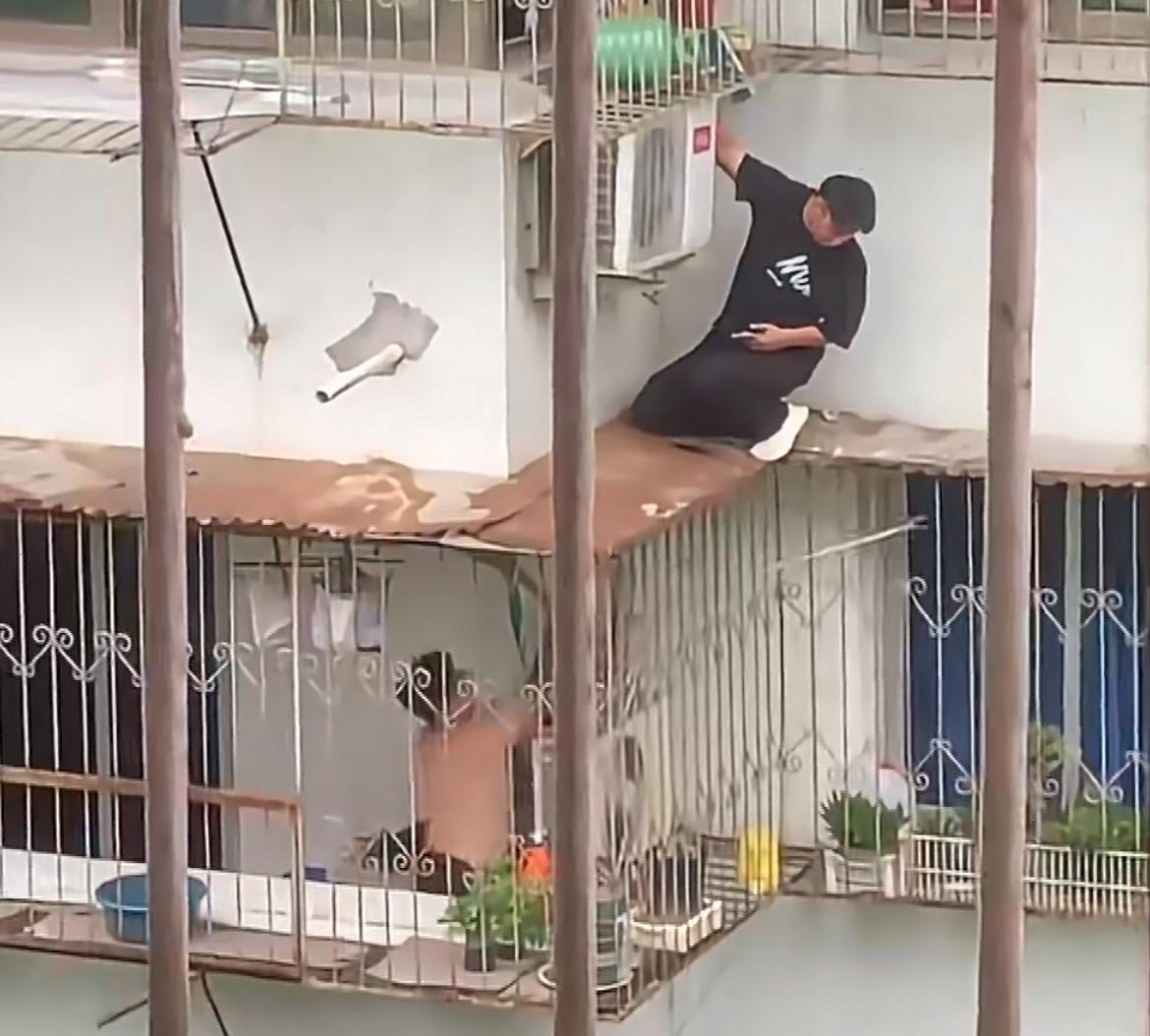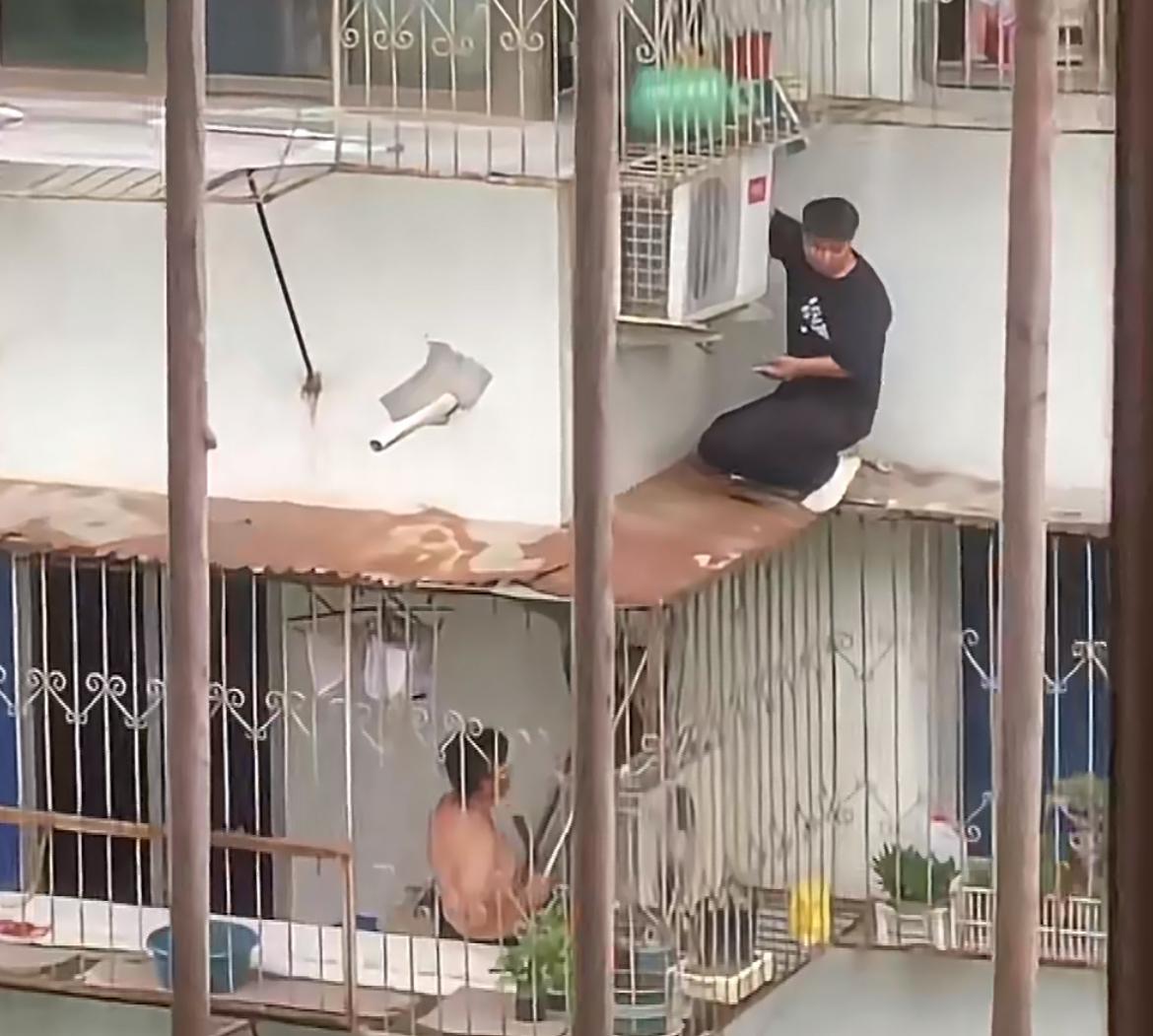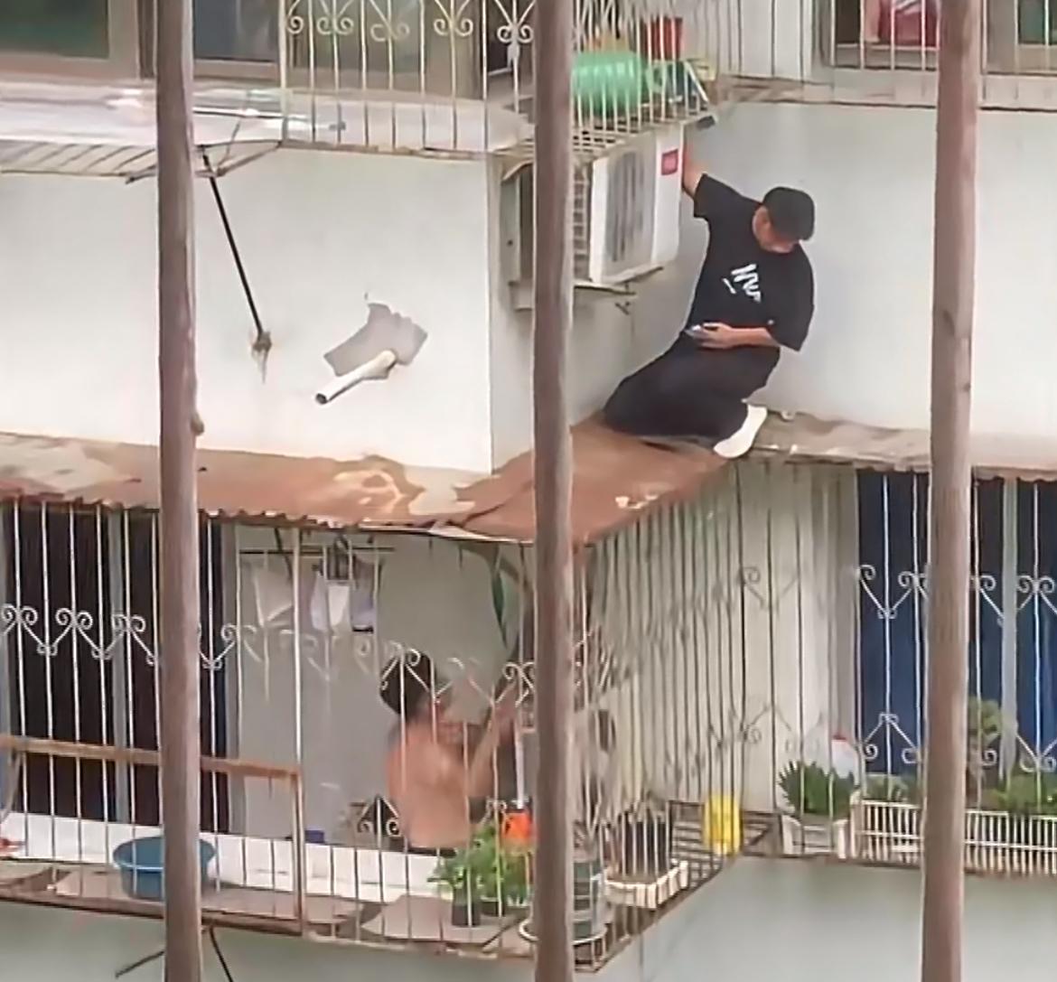 好一对卧龙凤雏,黑衣男子上面修空调,赤膊男子拿杆子下面捅。黑衣男子作为空调维修人员,高空作业不系安全绳,下面的赤膊男子压根不顾人家的安危,只担心自家的雨棚是不是被踩坏了。这要是把黑衣男子真弄下去了,这不是妥妥的过失杀人罪吗?什么脑子啊。工人装空调坠落 空调外机砸伤人