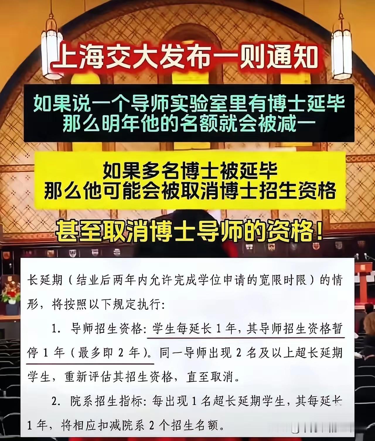 家里有博士娃的,终于等到这声“春雷” 只有家里有孩子在读博的家长,才懂那种深藏心底的煎熬与无奈。 孩子拿到博士录取通知书的那一刻,全家欢天喜地,以为苦尽甘来,往后就是光明的学术坦途。可谁能想到,真正的“炼狱模式”,从踏入实验室的那天才刚刚开启。读博的辛苦自不必说——没日没夜的实验、改不完的论文、熬不完的通宵。 但这还不是最可怕的,毕竟这些身体上的疲惫,咬咬牙还能扛过去。最怕的,是遇上那种把学生当“免费牛马”“科研工具人”的导师。 他们眼里只有项目和成果,只关心学生能为自己带来多少利益,却从不在意学生的毕业诉求。学生实验遇到瓶颈,他们视而不见;论文卡壳需要指导,他们敷衍了事;更有甚者,为了留住免费劳动力,故意拖延学生的毕业进度,今天说数据不够,明天说研究不深,硬生生把一届又一届学生拖成延毕大军。 看着孩子一天天被消磨得没了心气,眼神里的光一点点黯淡,作为家长,我们心疼却又无能为力,只能隔着屏幕一遍遍安慰,偷偷抹泪。这种看得见却摸不着的痛苦,压得人喘不过气。 所以,当看到上海交大出台新政,将博士延毕与导师招生资格直接挂钩——有学生延毕就核减次年名额,多名学生延毕就取消招生资格甚至博导资格时,我简直高兴得热泪盈眶!这哪里是什么普通通知,这分明是给万千博士家庭的一颗定心丸,是给那些无良博导戴上的“紧箍咒”! 终于有人出手管管这些乱象了!终于有人肯为那些被耽误的孩子撑腰了! 这纸新政,戳中了多少博士家庭的痛点,又点燃了多少家长的希望。真心盼着这份政策能尽快推广到全国所有高校,让每一位博士生都能摆脱“工具人”的命运,安心做研究,顺利毕业;让每一位博导都能回归育人初心,对得起“导师”二字的分量!