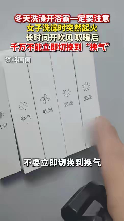 冬天洗澡惊魂!浴霸“换气”瞬间变“火灾隐患”,千万别再大意了! 每到冬天,家家户户都少不了浴室的“救星”——浴霸。暖暖的风,温暖的身体,成了寒冷季节里最温馨的享受。然而,你是否知道,一次简单的操作,竟可能让你陷入火灾的危险中?就在安徽,一位女子洗完澡后的一次“切换”,让火花如流星般飘落,差点酿成大祸。这到底是偶然还是潜藏的隐患?今天我们就来揭露浴霸背后的“秘密”,告诉你如何安全使用,避免悲剧重演! 冬天的到来,意味着气温骤降,家中的取暖设备也变得繁多起来。尤其是浴室,很多家庭为了方便和舒适,都会安装浴霸。洗澡前提前开启暖风,让浴室变得温暖如春,成了不少人的习惯。可是,你知道吗?浴霸其实是一台集暖风和换气于一体的电器,操作不当极易引发火灾。 据媒体报道,事件发生在安徽一位女子家中。那天,她刚吃完饭,觉得洗个热水澡可以好好休息。于是,她提前打开浴霸的暖风功能,让浴室变得温暖如春。等到浴室暖和后,她进去洗澡,享受着温暖的水流。洗完澡后,她习惯性地将暖风按钮切换到换气,准备通风换气。 然而,就在她刚刚出卫生间还没走出几步,浴霸突然发出一声巨响,接着“啪”的一声,火花像流星般飘落,现场一片火光!女子吓得惊叫一声,赶紧拔腿就跑,随即用湿毛巾扑灭火苗,避免火势蔓延。 事后,维修工人到场检查,发现浴霸的换气和暖风按钮其实是连在一起的,不能随意切换。长时间使用暖风后,如果突然切换到换气功能,极易造成短路,甚至引发火灾。所幸女子反应及时,没有造成更大的损失。 这起事件再次提醒我们,冬天使用浴霸时一定要格外注意。很多家庭习惯一边洗澡一边开暖风,觉得暖和就好,却忽略了操作的安全细节。浴霸作为高功率电器,使用不当很可能变成“定时炸弹”。 那么,如何安全使用浴霸呢?首先,务必详细阅读说明书,了解每个按钮的功能和注意事项。不要长时间连续使用暖风,尤其是在即将切换换气功能时,要等设备冷却或断电一段时间后再操作。其次,切勿在暖风长时间开启后,立即切换到换气功能,以免造成短路。更重要的是,定期检查浴霸的线路和接线情况,确保没有老化或松动的隐患。 此外,家庭中还应安装烟雾报警器和火灾报警器,确保第一时间发现火情。洗澡时,尽量不要让浴霸的线路暴露在潮湿环境中,避免漏电和短路风险。 不少网友看到此事后纷纷表示震惊:“第一次知道,原来操作不当会有这么大的危险。”“以后洗澡一定要注意,不要盲目操作。”也有人建议:“家里有老人和孩子的,特别要加强安全教育,避免悲剧发生。” 安全用电无小事,尤其是在寒冷的冬天。你家里使用浴霸有没有遇到过类似的情况?或者你有哪些安全使用的经验和建议?欢迎在评论区分享,让我们共同提高安全意识,守护家人平安!转发这篇文章,让更多人知道浴霸的“潜在危机”,一起防范火灾隐患,度过一个温暖又安全的冬天! 冬天洗澡虽暖心,但安全更重要。掌握正确的操作方法,定期检查设备,才能让浴室成为温馨的港湾,而不是危险的“火药桶”。记住:用电安全,人人有责。让我们共同努力,远离火灾风险,享受一个温暖、安全的冬季!
