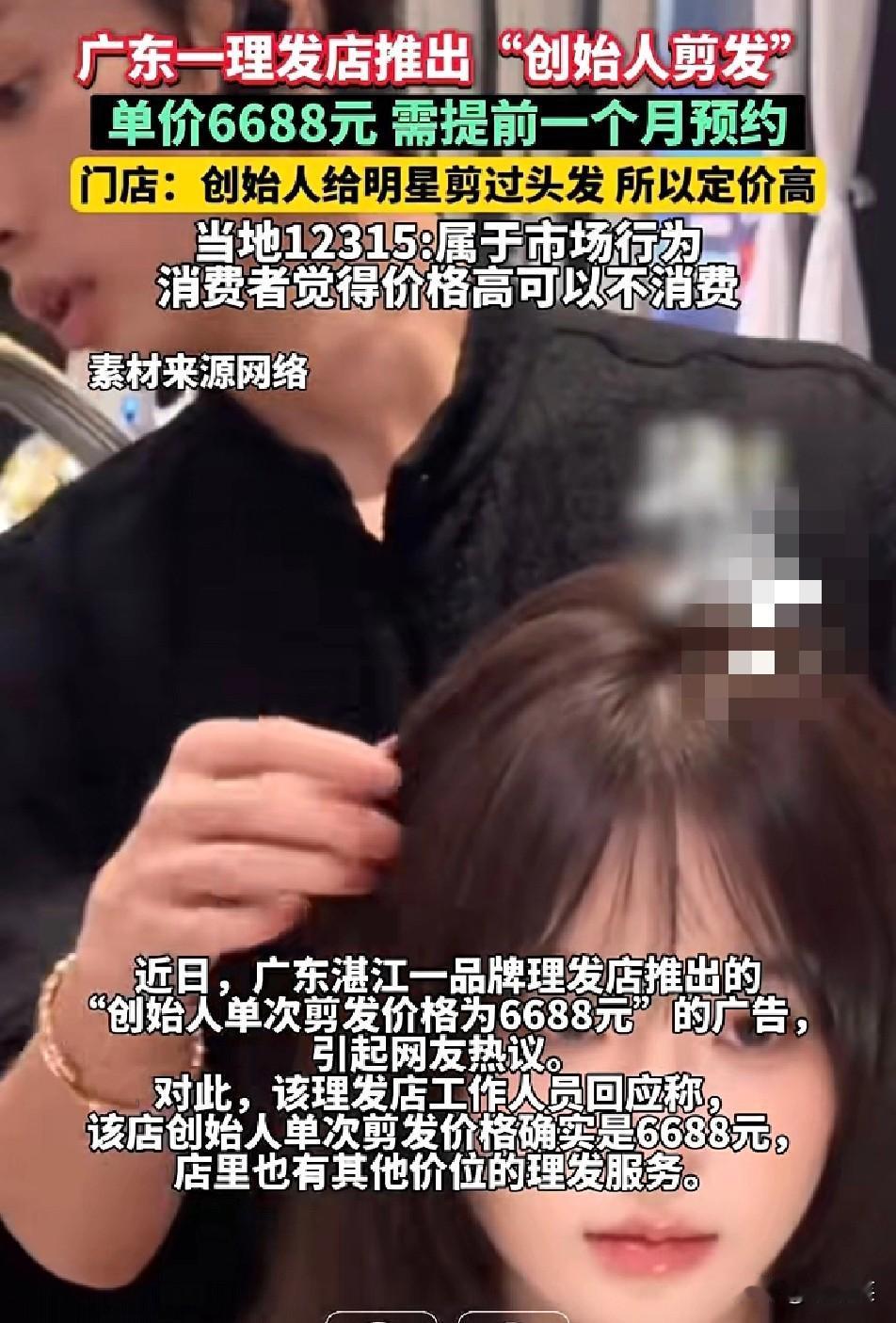 离谱 广东湛江一家理发店的定价直接看呆网友 店里推出的“创始人剪发”服务标价6688元一次 还得提前一个月预约 门店工作人员称,因为创始人给不少明星剪过头发,所以定价才这么高 而且还有不少顾客专门找他剪发 记者咨询当地12315后得到回应 这一价格属于市场行为,消费者觉得贵可以选择不消费 网友们纷纷吐槽“剪的不是头发是金子吧” 也有人调侃“贫穷限制了我的理发自由” 你觉得6688元剪一次头发值吗?这是合理的市场定价还是噱头式割韭菜?