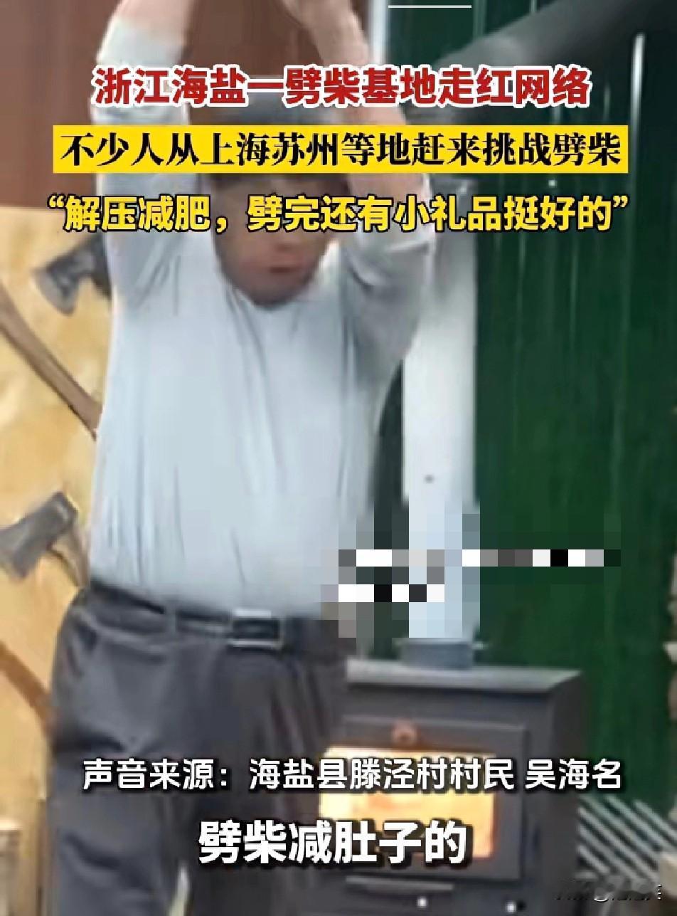 太会玩了! 浙江海盐的一个劈柴基地突然爆火 不仅本地人爱来,就连上海、苏州的游客都特意跨省赶来体验! 基地负责人说,劈柴是全身运动,能解压还能减肥,劈完还会送小礼品 高峰时一天有超200人体验,线上直播单次观看人数还冲到了4.6万 游客们都说挥着斧头劈柴的瞬间,工作和生活的压力都跟着散了 还有人调侃“终于找到不用办健身卡的减肥方式” 你觉得这种原生态的解压方式靠谱吗 比起健身房,劈柴这种体力活真的更能让人放松吗