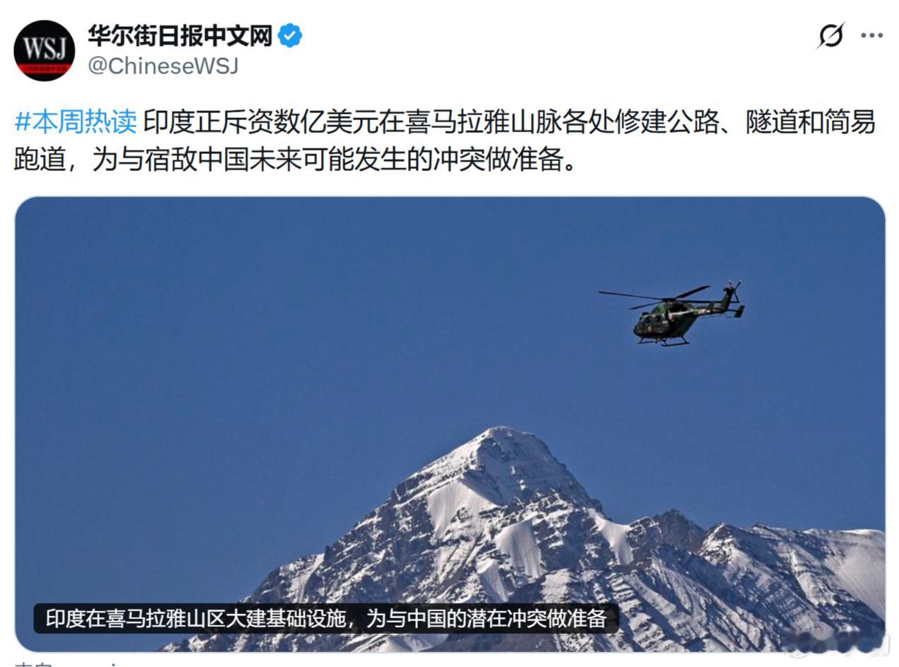华尔街日报:印度正斥资数亿美元在喜马拉雅山脉各处修建公路、隧道和简易跑道,为与宿敌中国未来可能发生的冲突做准备。把中国当宿敌是印度国内的普遍民意和政客共识,即便在国力比中国差许多的时候,它们也时不时想偷袭你。有些国家,你不趁着国力强盛的时候把它们打服,至少要限制它的发展,还幻想着“龙象共舞”,就是与虎谋皮。这样的国家,不仅要限制对其大规模的基础建设和高科技产业投资,还要限制其留学生和学者来中国学习理工科。让他们学文科就好。