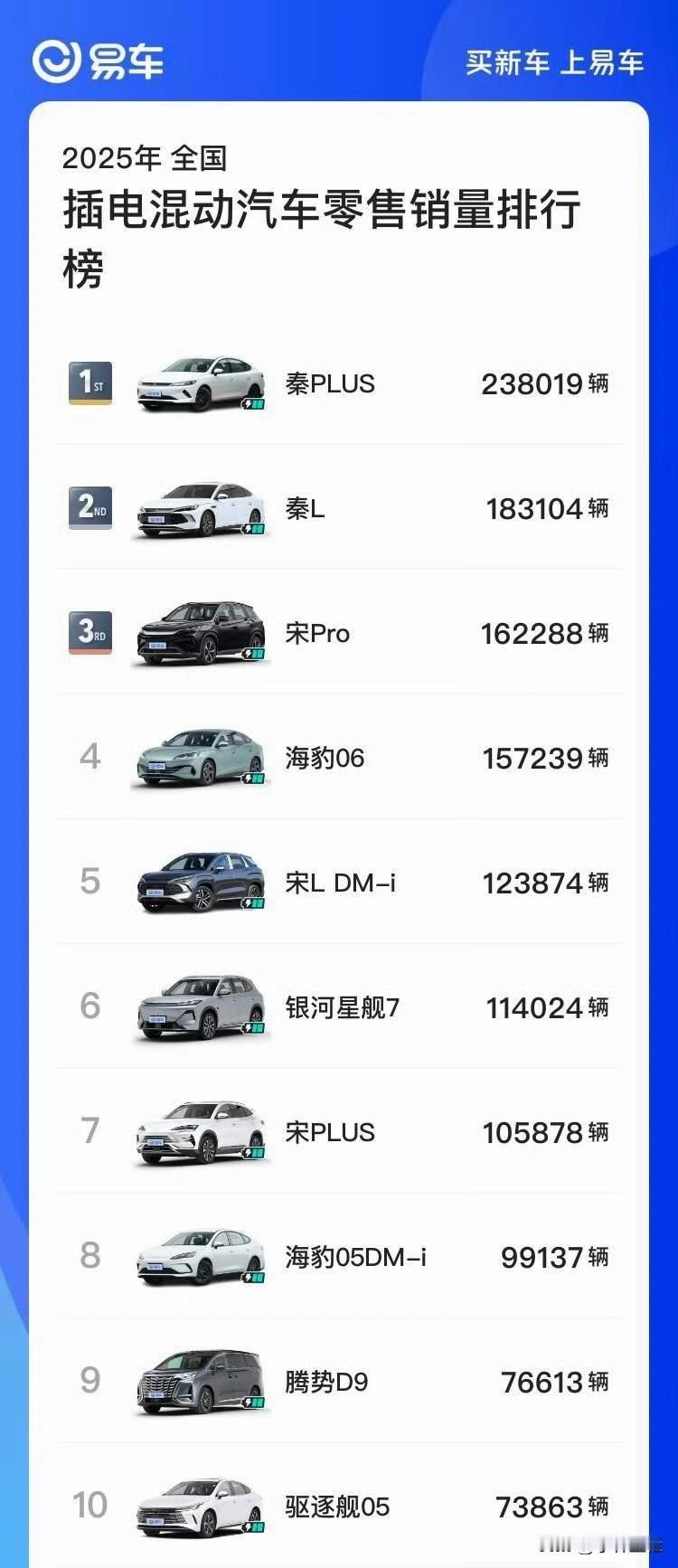 来自媒体平台统计的2025年国内插电式混动排行前10榜,比亚迪遥遥领先同行,占领9席位,吉利占领1席位,成为非比亚迪车型中的“独苗”! 具体明细为: 秦Plus:238019辆,排名第一; 秦L:183014辆,排名第二; 宋Pro:162288辆,排名第三; 海豹06:157239辆,排名第四; 宋L:123784辆,排名第五; 吉利银河星舰7:114024辆,排名第六; 宋Plus:105878辆,排名第七; 海豹05:99137辆,排名第八; 腾势D9:76133辆,排名第九; 驱逐舰05:73863辆,排名第十; 该说不说,目前所有车企中,就新能源车销量,特别是插电式混动车型销量,能跟比亚迪有一战之力的,也就只有吉利了!