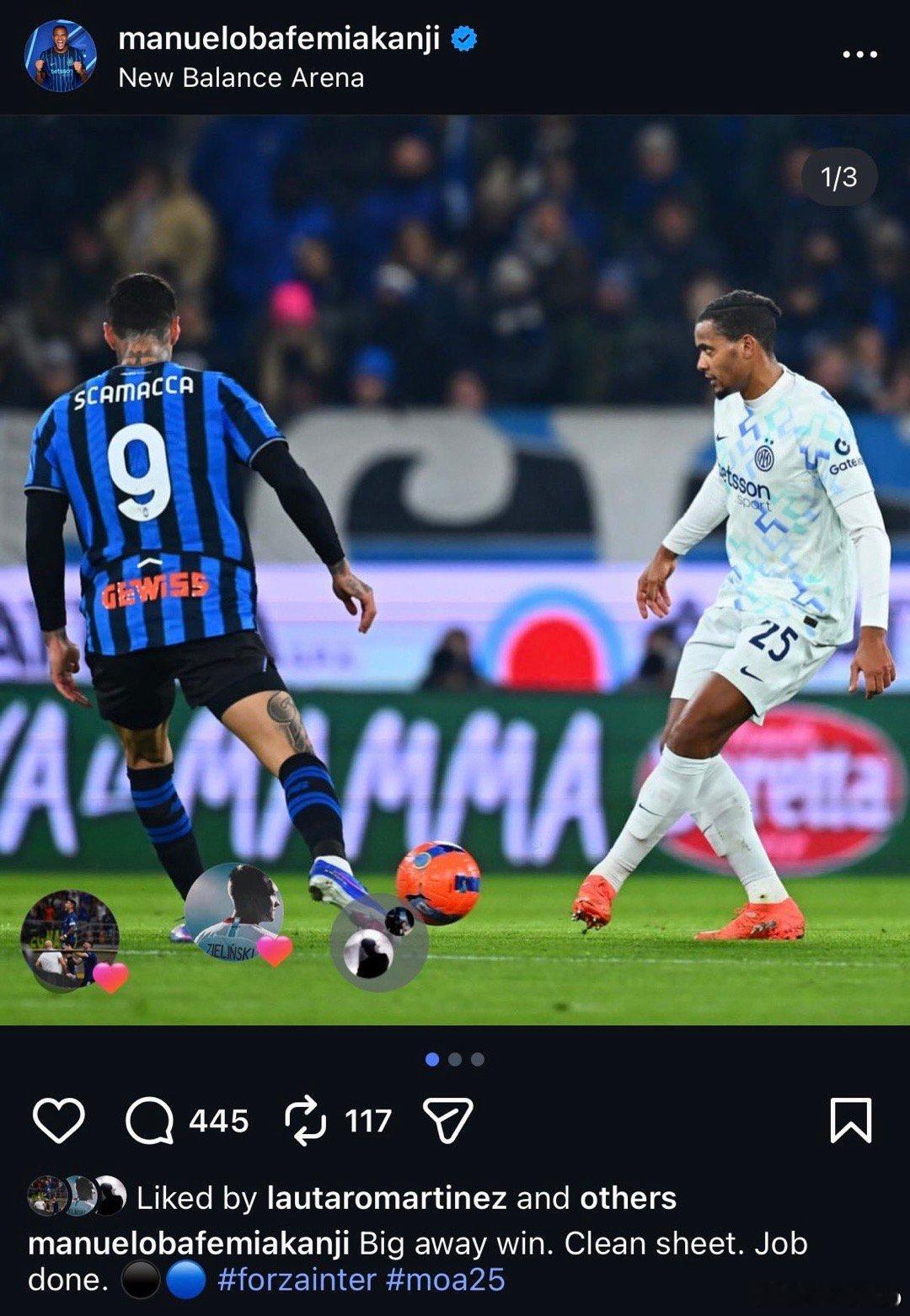 阿坎吉社交媒体:重要的客场胜利 零封 任务完成国际米兰亚特兰大0比1国际米兰热点现场 中流砥柱之一👍