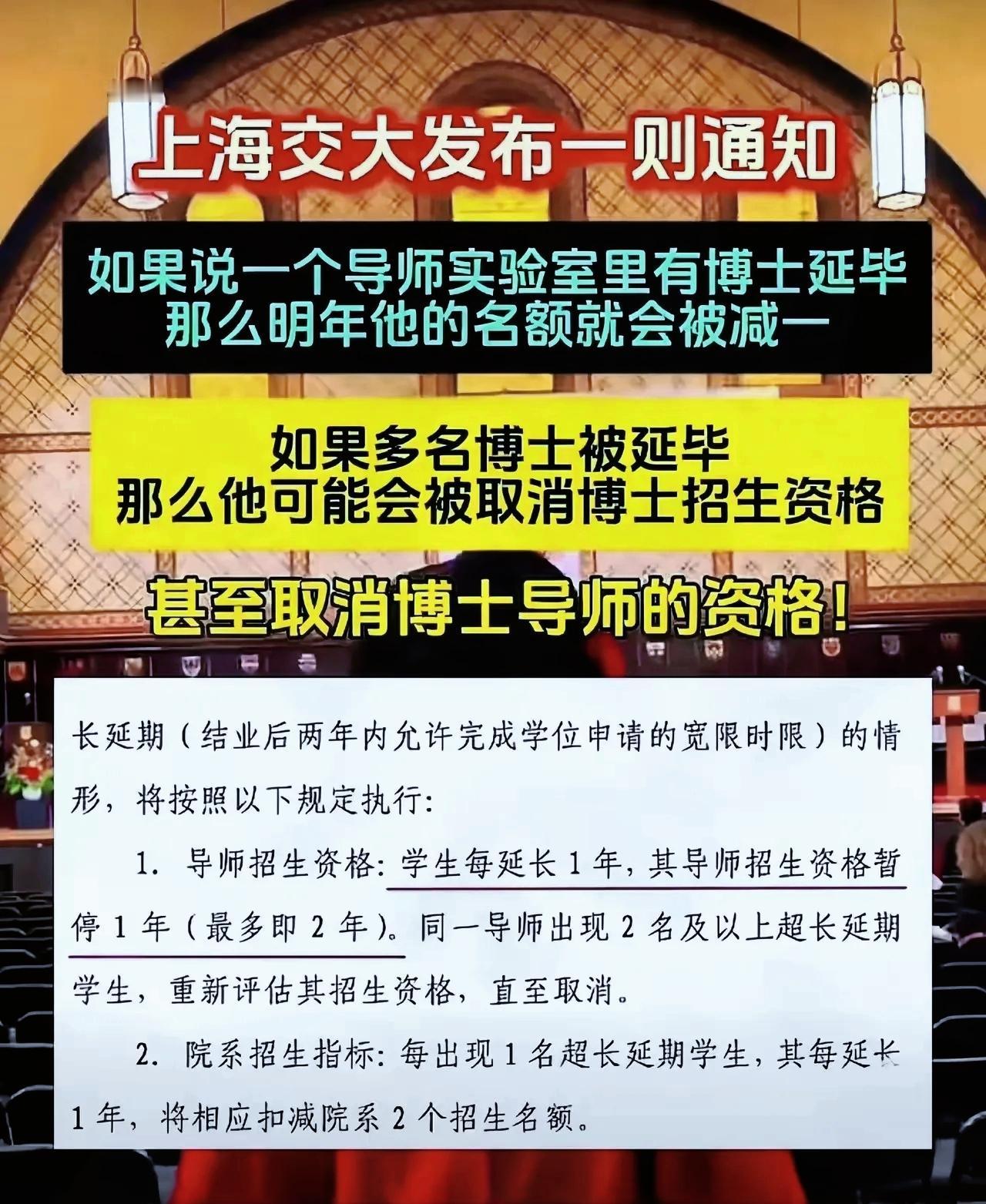 上海交大出台通告, 博士生延期对导师追责严苛, 延期一年导师停招一年, 两年则可能取消博导招生资格, 有效遏制导师压榨学生、 无限期留人的行为。