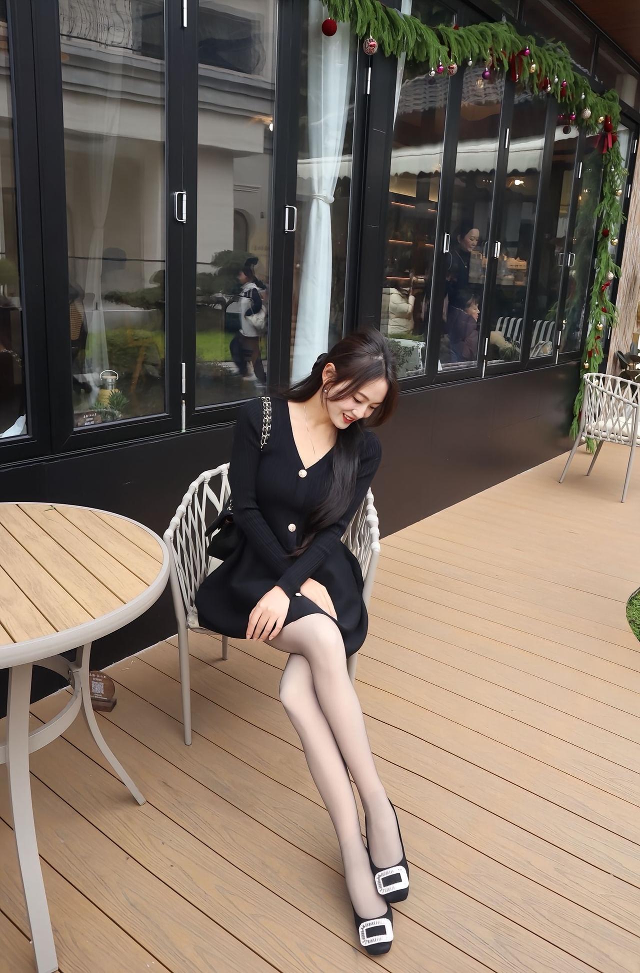 今日穿搭以灰色一字肩麻花针织毛衣裙为主打,搭配黑丝与带钻饰的黑色尖头高跟鞋,走的