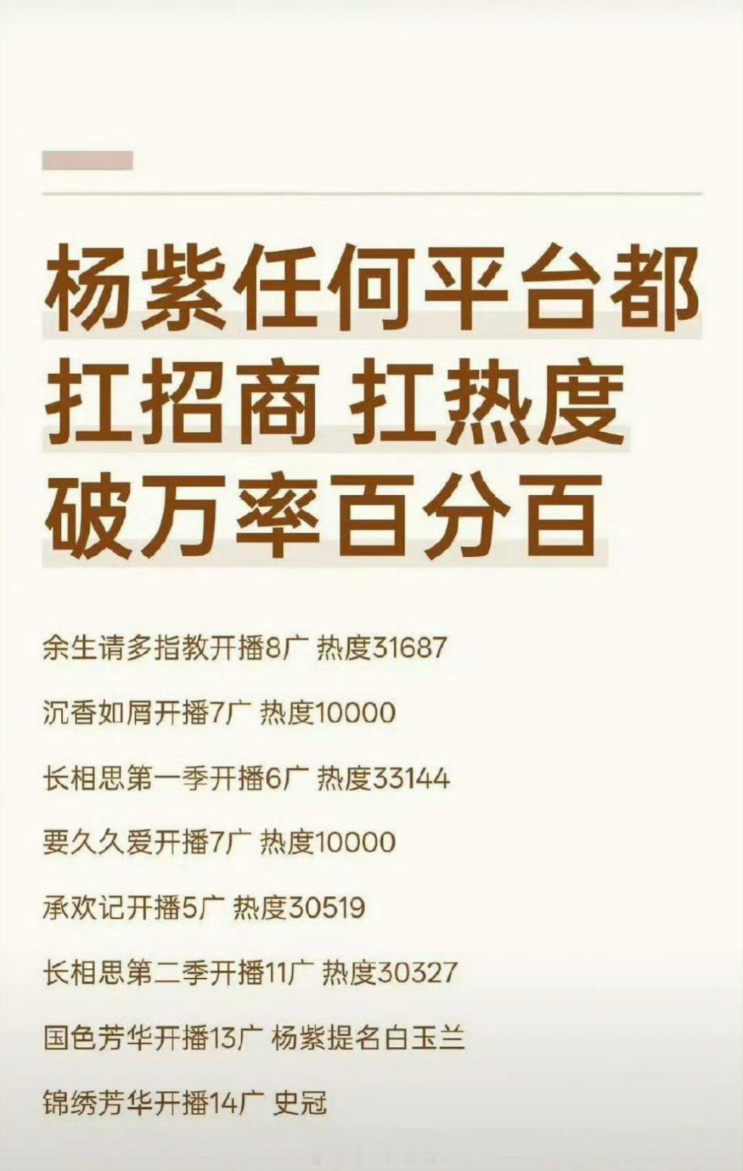 有网友汇总了一下杨紫的实绩,不管是从收视率还是招商能力来看,好像都还是挺不错的,算得上是90花里面的top1不?