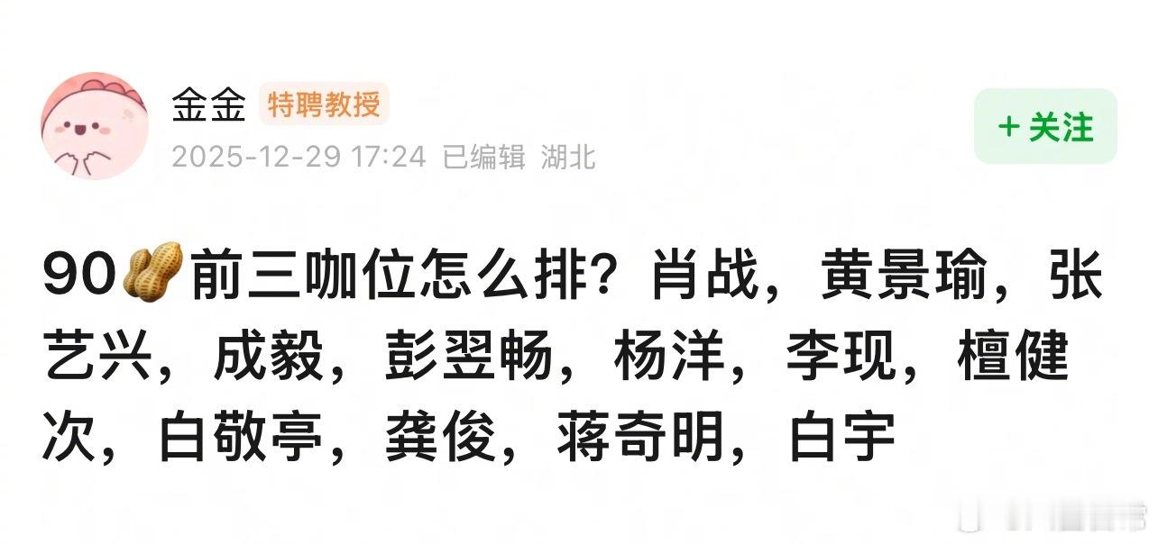 90生咖位前三怎么排?肖战、黄景瑜、张艺兴、成毅、彭昱畅、杨洋、李现、檀健次、白敬亭、龚俊、蒋奇明、白宇