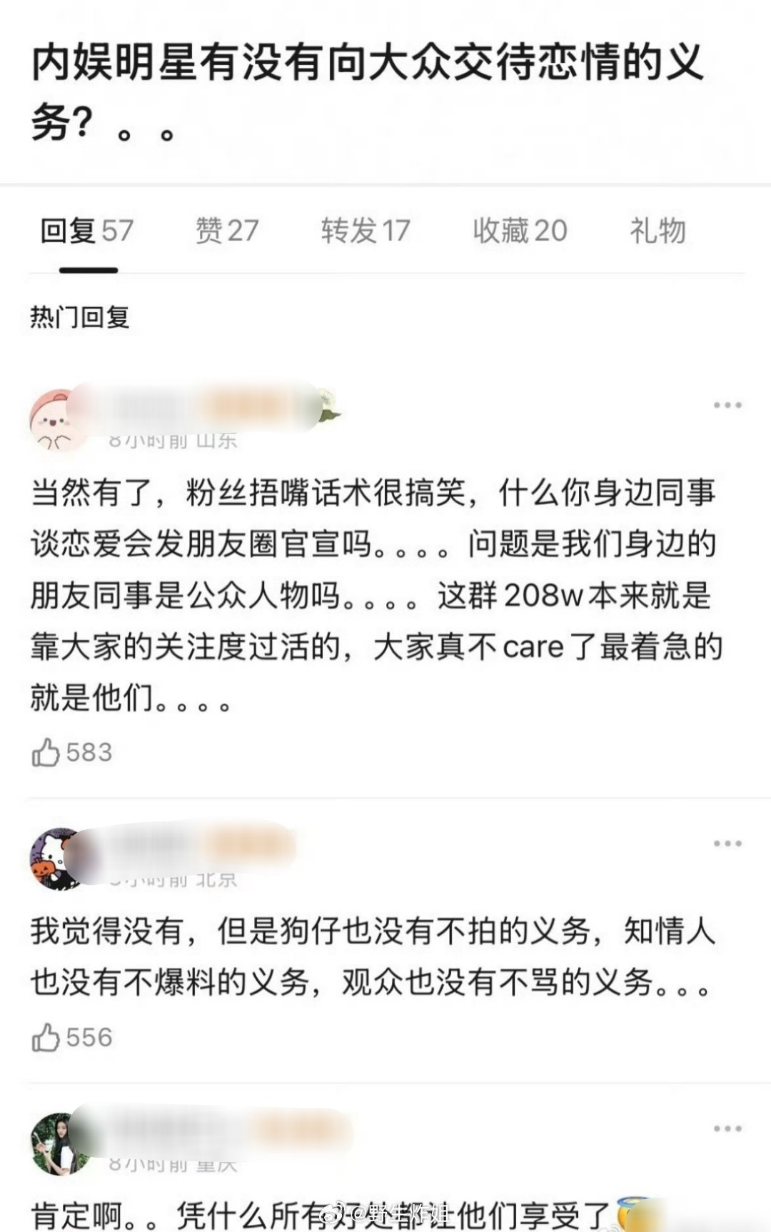许多网友都觉得内娱的明星有向大众交代恋情的义务,毕竟这些208w们就是靠大家的关注度来赚钱的,所以也应该给大家一个交代,你咋看呢?