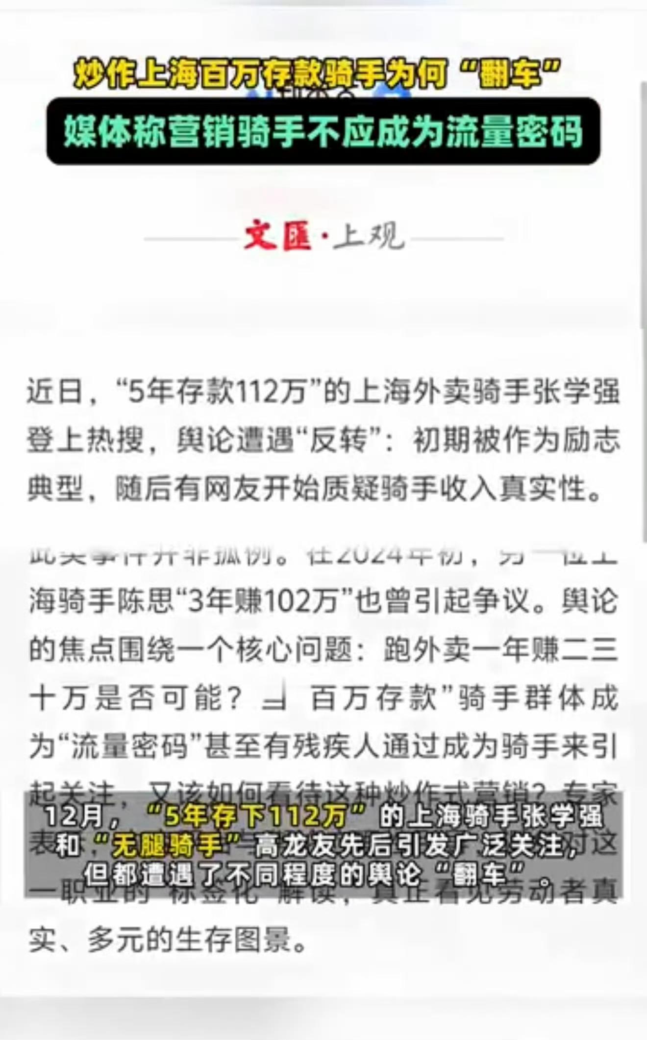 媒体称炒作骑手不应成为流量密码前不久这个5年存百万的外卖小哥,反正我是觉得有点扯,这玩意合不合理算算账就知道了。5年存112万,每年22.4万,每个月18666元,每天622元,这是存的,如果再算上吃住,每天怎么着也要800+,这可太难了。炒作上海百万存款骑手为何翻车
