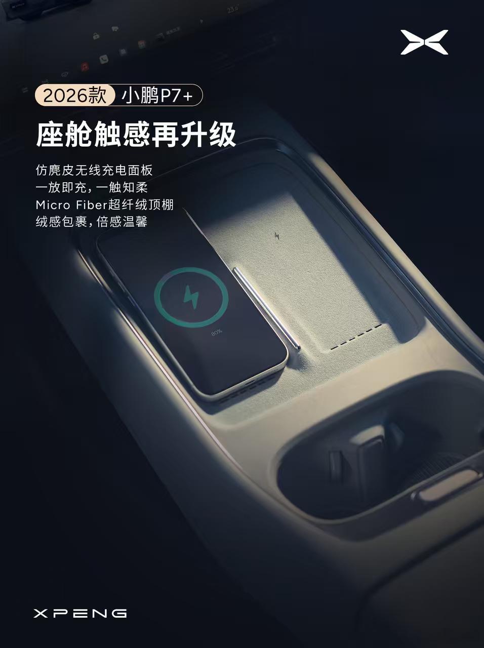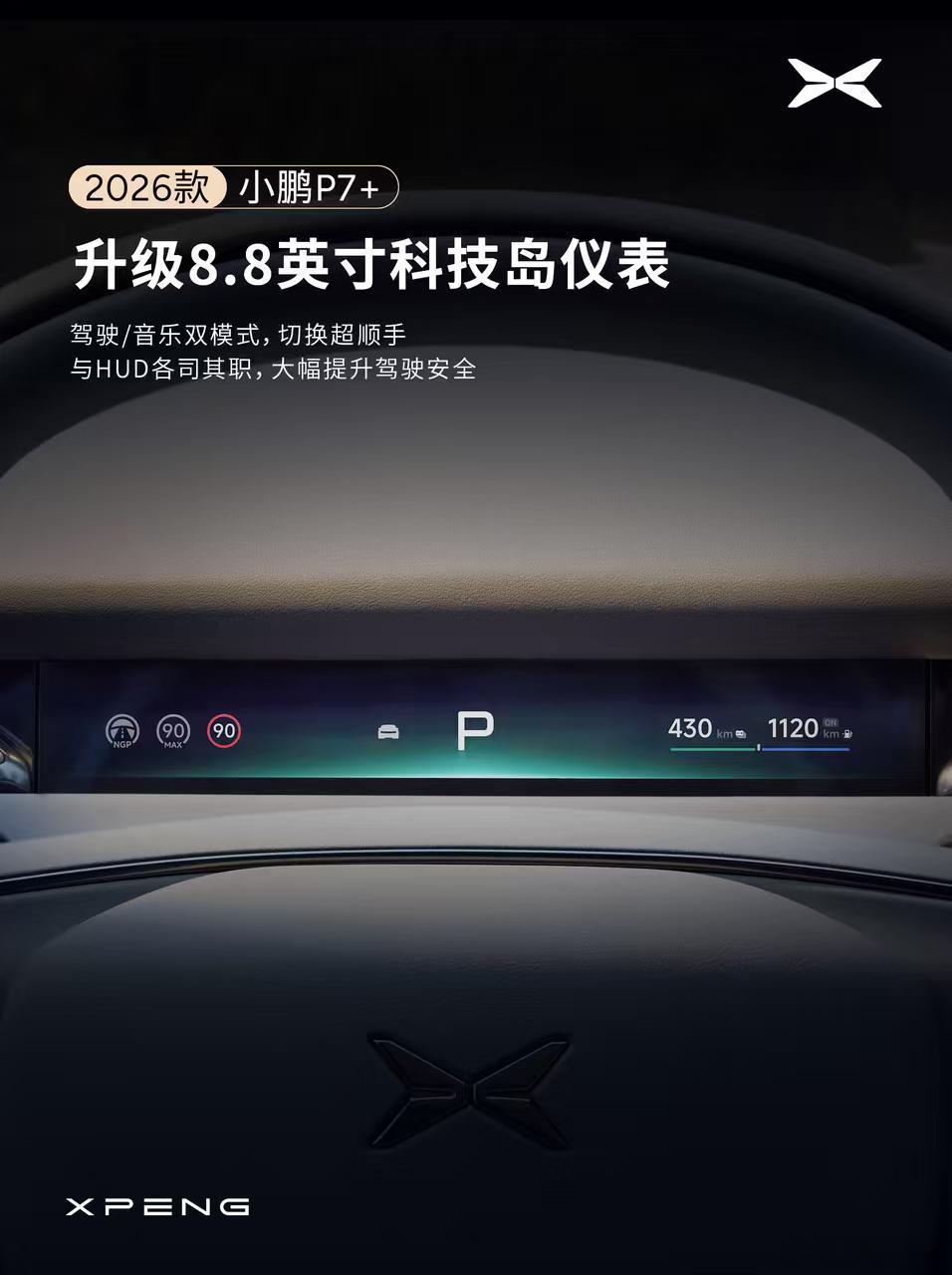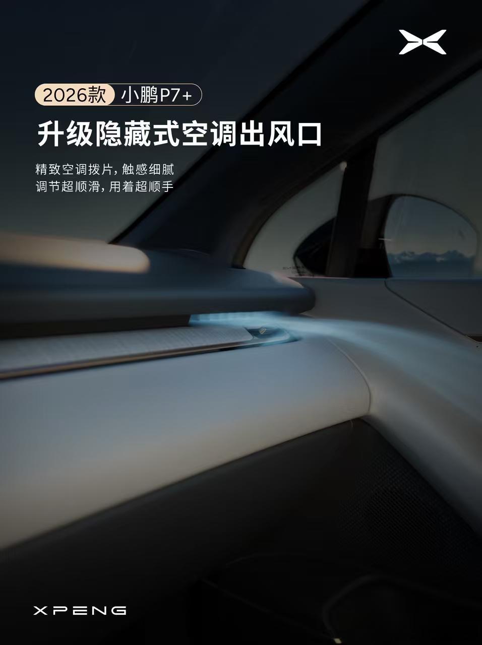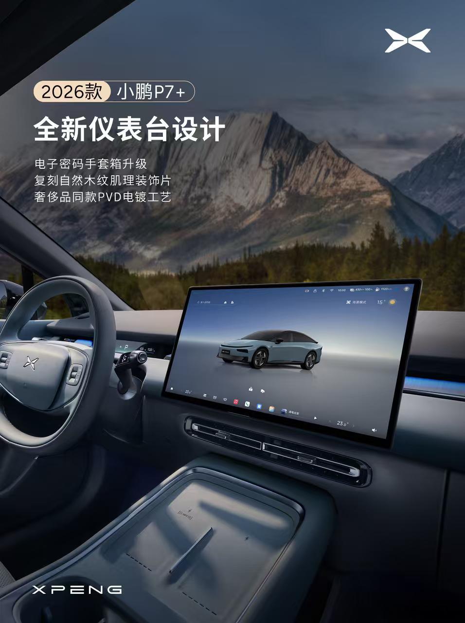 新款小鹏P7+质感全面升级P7+的内饰也正式官宣了!图1、全新设计的中控,风格像p7,整体变得更时尚。图2、新的仪表盘,和p7一样窄窄的一条。图3、x9增程同款hud,因为有hud,所以仪表盘可以做的很窄了。图4、全新出风口设计,还多了木纹装饰。图5、反射式门板氛围灯。图6、中控材质提升。总结来说内饰设计上更年轻、更时尚、科技感更强,用料更好,还增加了2个更活泼的内饰配色,内饰我给全方位好评