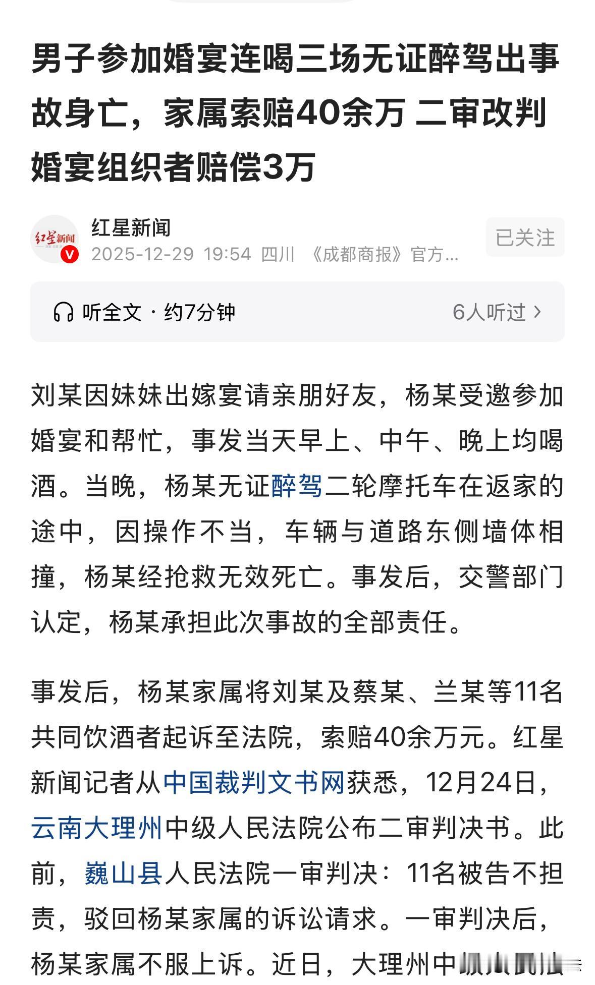 云南大理,男子受朋友邀请参加婚宴并帮忙筹备,从早到晚都在婚礼上忙碌着,一日三餐也是跟着朋友吃的,顿顿都喝了酒。婚礼完成后,男子骑摩托车回家,途中撞墙身亡,因无证驾驶,交警部门认定男子承担全部责任。事后男子家属将朋友以及一起喝酒的11人告上法庭索赔40万元,一审判决不用赔偿,二审却改判了!   杨某为人热情且仗义,在朋友提出帮忙请求的时候从来不拒绝,只要能喝两口酒就行,朋友们也乐意找杨某帮忙。   在2025年1月9日,是刘某妹妹出嫁的日子。对于刘某家来说这是大事,但是家里的人手不够,所以刘某就想到了杨某,打电话把杨某找个过来。   杨某一听说是帮忙婚宴,二话不说,骑着摩托车就赶了过来。刘某很感谢杨某的及时救场,马上就安排了一桌酒席让杨某先喝个痛快。   杨某只要是有酒喝,其他的都是次要的。但是婚宴还得忙一整天,所以杨某也没敢多喝,就怕耽误正事。   杨某看着刘某的妹妹出嫁,心中为好朋友高兴,刘某心里的一块大石头终于落了地。   忙里忙外的张罗了一整天,杨某终于在晚上6点多才能坐在饭桌上吃口饭,而这桌上的11个人,都是刘某请来帮忙的朋友,特意给他们留的一桌酒席。   刘某也忙了一天累坏了,就张罗着一桌人喝酒吃饭,毕竟都已经累了一天了,喝喝酒解解乏,喝完就各自回家休息。   刘某看着杨某骑着摩托车离开,还有点担心,毕竟杨某喝了不少酒,是杨某说没事,刘某才让杨某自己回家的。   在杨某离开后2个小时,刘某就得到消息,杨某发生了意外,在骑摩托回家的途中因操作不当撞上了墙,经过抢救不治身亡。   次日,刘某和同桌喝酒的几个人被叫到镇调解委员会调解,几个人分别拿出一笔钱垫付了丧葬费,共计3万元,希望杨某能够尽早入土为安。   虽然刘某和其他几个人觉得杨某的死亡和自己没有关系,但是出于人道主义,还是凑出了一笔钱给杨某的家属。   交警出具完事故认定书后,杨某家属就把刘某和同桌喝酒的其他11个人一同告上法庭索赔40余万元。   事故认定书里载明,杨某系操作不当导致的撞墙受伤,后经抢救无效死亡。且杨某并无机动车驾驶证,属于无证驾驶,因此杨某负事故的全部责任。   杨某在发生事故的时候血液酒精含量为198.86mg/100ml,属于醉酒驾驶。   杨某在骑行过程中还没有佩戴安全头盔,杨某驾驶的摩托车未悬挂机动车号牌、未进行车辆安全技术检验、未购买第三者责任强制保险,属违法行为。   按照交警部门出具的事故认定书,杨某的死亡与其他任何人都没有关系。但是杨某家属确认为,若是没有骑车前的饮酒行为,也就不会发生一系列事故。   所以杨某家属将同桌喝酒的11个人一起告上法庭索赔405771.264元,其中刘某需要承担25%的赔偿责任,其他10人连带承担15%赔偿责任。   一审法院审理后认为:   刘某宴请杨某参加婚礼并让杨某帮忙婚宴,在席间提供酒水是传统习俗,不存在过错。   其他同桌喝酒吃饭的10个人与杨某也不存在隶属关系,席间都是各自喝各自的,没有劝酒灌酒的行为,10个同桌吃饭的人也不存在过错。   杨某发生意外身亡,主要原因是无证并醉酒驾驶导致的意外发生身亡,且交警部门认定杨某承担全部的责任。   且刘某和其他几个人自愿拿出3万元丧葬费给杨某家属,并不要求返还,也是尽到了人道主义,不应过多苛责。   因此一审法院认为杨某家属赔偿无事实及法律依据,法院不予支持,驳回杨某家属的诉求。   一审判决后,杨某家属不服判决提起上诉,二审给出不同看法。   刘某作为婚宴的组织者,宴请杨某参加婚礼并帮忙,在婚礼当天的早上、中午和晚上分别都喝了酒,在这个过程中杨某已经有醉酒迹象。   虽然杨某最后和其他11个人一桌喝酒,但是其他10个人并没有劝酒的行为,因此其他10个人不存在过错。   根据《民法典》第1165条的规定:行为人因过错侵害他人民事权益造成损害的,应当承担侵权责任。   依照法律规定推定行为人有过错,其不能证明自己没有过错的,应当承担侵权责任。   而刘某已知杨某醉酒后,还放任杨某独自骑车回家。作为婚宴的组织者、邀请者和晚宴的共同饮酒者,有义务、有条件、有能力劝阻杨某不要骑车回家。   但是刘某却并未对杨某的行为进行制止,也没有护送杨某回家,也没有通知杨某家属,而后杨某醉酒驾车身亡。   根据《民法典》第1179条的规定:侵害他人造成人身损害的,应当赔偿医疗费、护理费、交通费、营养费、住院伙食补助费等为治疗和康复支出的合理费用,以及因误工减少的收入。造成残疾的,还应当赔偿辅助器具费和残疾赔偿金;造成死亡的,还应当赔偿丧葬费和死亡赔偿金。   法院酌情判决刘某赔偿损失3万元,扣除掉已经垫付的7000元丧葬费,刘某还应赔偿杨某家属2.3万元。