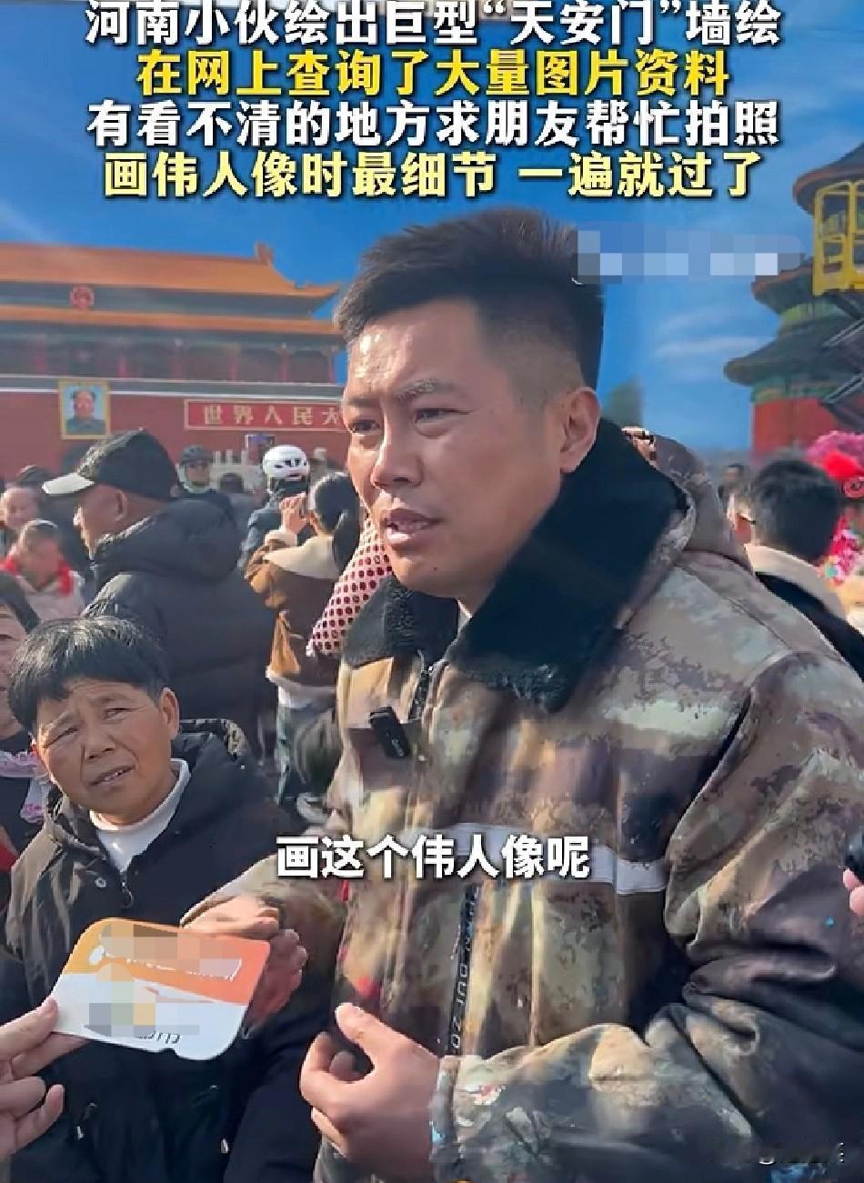 暖哭 河南一村头突然出现巨型天安门墙绘 背后的原因太戳心了 村里不少老人一辈子没去过北京,总念叨着想看看天安门 小伙看在眼里记在心里,干脆拿起画笔,把天安门“搬”到了村里的墙上 为了画得逼真,他网上查遍资料 看不清的细节还托朋友去北京实拍,画伟人像时更是小心翼翼,最终一气呵成 如今老人们每天都来墙绘前转转,嘴里念叨着“这下总算见到天安门了” 一支画笔,圆了一群老人的心愿 这才是最有温度的艺术!你被这份心意打动了吗?