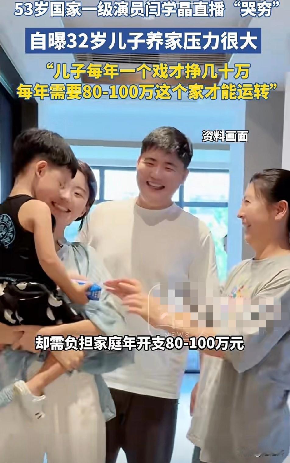 53岁国家一级演员闫学晶 直播时的一番话 直接让网友炸开了锅! 她坦言32岁儿子每年演一个戏才挣几十万 可家里一年要80-100万才能运转,儿子养家压力大到让她心疼 闫学晶还透露儿媳是音乐剧演员小两口的收入加起来也填不上家庭开支的缺口 这番“哭穷”言论一出,评论区直接吵翻 有人觉得明星的生活成本本就高,这份压力真实 也有人吐槽“年入几十万还喊穷,让普通人怎么活” 其实不同圈层有不同的生活成本 但这样的“贫富认知差”,确实让不少网友难以共情 你觉得闫学晶的“穷”,是真压力还是凡尔赛?