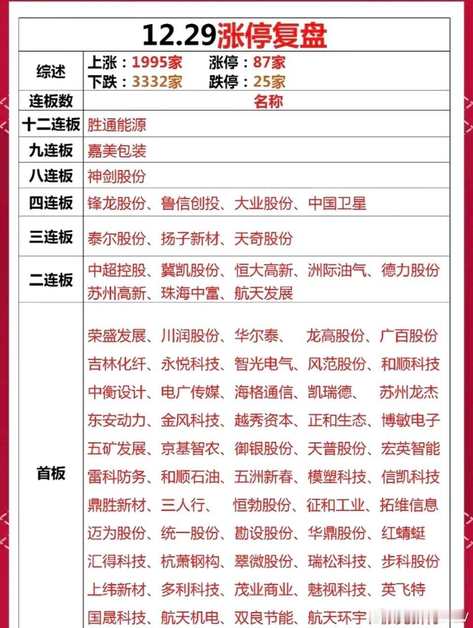 12月29日A股涨停连板股全景梳理:高标领涨,军工能源成核心战场12月29日A股市场呈现分化态势,当日上涨个股1995家、下跌3332家,涨停87家、跌停25家。连板梯队高度分化,最高连板高度被十二连板的胜通能源锁定,九连板、八连板各有1只,四连板4只、三连板3只、二连板8只,连板股集中分布在能源、包装、化工、军工、创投等赛道,高位连板股凸显市场局部强势情绪,低位连板则体现板块轮动特征。核心连板标的深度解析1. 胜通能源(十二连板):拿下当日最高连板高度,成为市场短线情绪标杆。作为能源类标的,十二连板的强势走势不仅反映资金对能源板块细分赛道的持续炒作,更凸显其在当下市场中的龙头溢价,是短线资金抱团的核心标的。2. 嘉美包装(九连板):位列连板高度第二,作为包装印刷板块标的,打破板块常规短线炒作周期,走出超预期连板行情。资金对消费包装赛道的关注度因其一浪走高而显著提升,也使其成为消费板块中罕见的高位连板标的。3. 神剑股份(八连板):化工新材料赛道龙头,斩获八连板,稳坐化工板块连板龙头宝座。股价持续走高既依托化工新材料的优质赛道逻辑,也得益于短线资金的持续接力,成为化工板块情绪的风向标。4. 锋龙股份(四连板):机械制造类标的,是四连板梯队的核心成员。其连板走势直观体现资金对高端制造细分赛道的炒作热情,也反映出板块内个股的轮动炒作特征。5. 鲁信创投(四连板):创投板块标的,依托鲜明的题材属性吸引资金布局。在市场情绪偏局部强势的背景下,题材股的连板溢价凸显,使其成为创投板块的资金焦点。6. 大业股份(四连板):金属制品类标的,是四连板梯队中的传统制造代表。资金对工业制造板块细分领域的持续挖掘,使其走出四连板行情,体现传统制造赛道的短线炒作机会。7. 中国卫星(四连板):军工卫星龙头,四连板走势背后离不开军工板块的资金热度加持。作为军工核心标的,其连板表现既依托板块强势逻辑,也成为军工赛道的情绪领涨标的之一。8. 泰尔股份(三连板):智能装备赛道代表,是三连板梯队的标杆。资金对智能装备赛道的短线炒作意愿强烈,其连板表现有效带动板块内相关个股的活跃度。9. 扬子新材(三连板):新材料板块标的,依托赛道属性获资金持续接力。三连板走势反映出资金对新材料细分领域的持续关注,是板块内的短线强势标的。10. 天奇股份(三连板):兼具智能装备与锂电回收双概念,题材叠加属性吸引资金青睐。其连板走势既受益于概念热度,也体现出资金对复合题材标的的偏好。11. 中超控股(二连板):电缆制造标的,属于二连板梯队中的传统制造标的。资金对电力设备板块的轮动炒作,使其走出二连板行情,是板块内短线资金布局的重要标的。12. 冀凯股份(二连板):矿山机械标的,叠加军工与机械双重概念。在军工板块热度扩散的背景下,其连板走势体现出板块内细分标的的轮动机会。13. 恒大高新(二连板):兼具节能环保与光伏概念,题材叠加优势吸引资金接力。新能源板块的局部热度为其助力,二连板走势反映出资金对新能源细分赛道的深度挖掘。14. 洲际油气(二连板):油气开采标的,能源板块的热度扩散至油气领域。在胜通能源高位连板的带动下,能源细分标的获资金炒作,走出二连板行情。15. 德力股份(二连板):兼具玻璃制造与文化传媒双概念,题材多元化特征吸引资金关注。其连板表现体现出市场对跨界题材标的的炒作偏好,是短线资金博弈的热门标的。16. 苏州高新(二连板):房地产与园区开发标的,地产板块的局部修复为其赋能。在地产板块情绪回暖的背景下,其连板走势反映出板块内标的的短线机会。17. 珠海中富(二连板):包装印刷标的,与嘉美包装形成板块联动效应。包装板块因龙头的高位连板获得资金关注,其作为跟风标的走出二连板,体现板块炒作的联动性特征。18. 航天发展(二连板):军工信息化标的,军工板块的持续资金布局使其拿下二连板。作为军工核心标的,其二连板走势进一步巩固军工板块的热度,是板块内的强势标的。首板核心标的看点1. 雷科防务(首板):军工电子核心标的,虽未晋级连板,但当日获资金强势推动涨停,与连板军工股形成板块共振,是军工赛道资金布局的重要标的。2. 拓维信息(首板):人工智能赛道核心标的,科技板块的局部热度使其斩获首板。首板走势反映出资金对科技板块的轮动关注,是科技股的短线强势标的。榜单总结今日涨停连板股呈现“高标独苗领涨、低位连板补涨”的鲜明格局,十二连板的胜通能源成为市场情绪锚点,军工、能源、化工、包装是连板股集中的核心板块。高位连板股体现出资金抱团的极致性,低位连板则反映出板块内的轮动炒作逻辑。本文涉及资讯、数据等内容来自网络公共信息,仅供参考,不构成投资建议!
