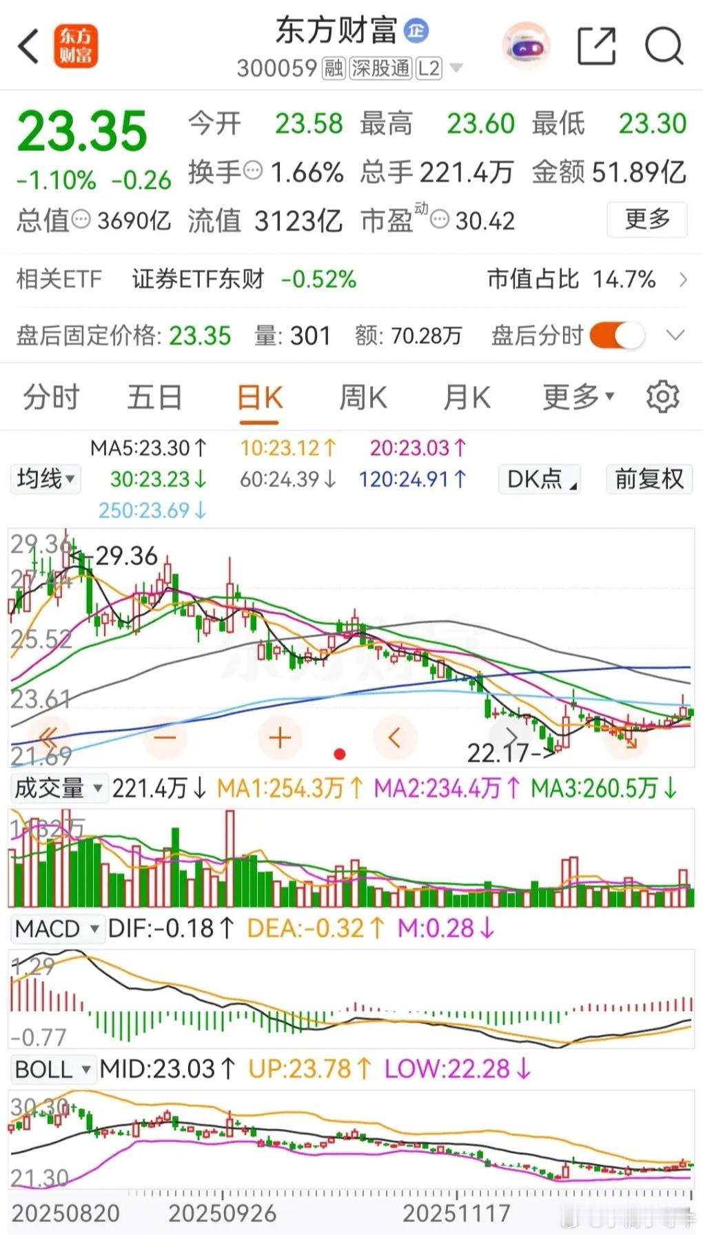 东方财富今天低开低走,被主力资金大幅净卖出了6.35亿元,而中信证券则是冲高回落,收出了一根缩量十字星,且连续三天被主力资金净买入。东方财富今天的整体走势是,早盘低开后震荡走低,几乎就是以最低价收盘,全天的跌幅为1.10%,收盘报价为23.35元。在资金流向上,今天被主力资金大幅净卖出了6.3500亿元,而近五个交易日则是被主力资金合计净卖出了1.9250亿元。从走势上看,日线级别走势在连续上涨三天后,今天缩量回调,整体走势还是比较健康的。中信证券今天的走势与东方财富有些不一样,早盘低开后冲高回落,尾盘时小幅勾起,最终收出一根缩量小阳星,走势上处于多头排列,明显强于东财。截止收盘时,小幅下跌了 0.55%,收盘报价为28.94元,全天的成交额为26.28亿元。在资金流向上,连续三天被主力资金净买入,今天被主力资金小幅净买入了0.2453亿元,而近五个交易日则是被主力资金合计净卖出了0.5355亿元。至于二者的后续走势和技术分析,可以查看上一篇中关于券商概念板块今天的走势分析。