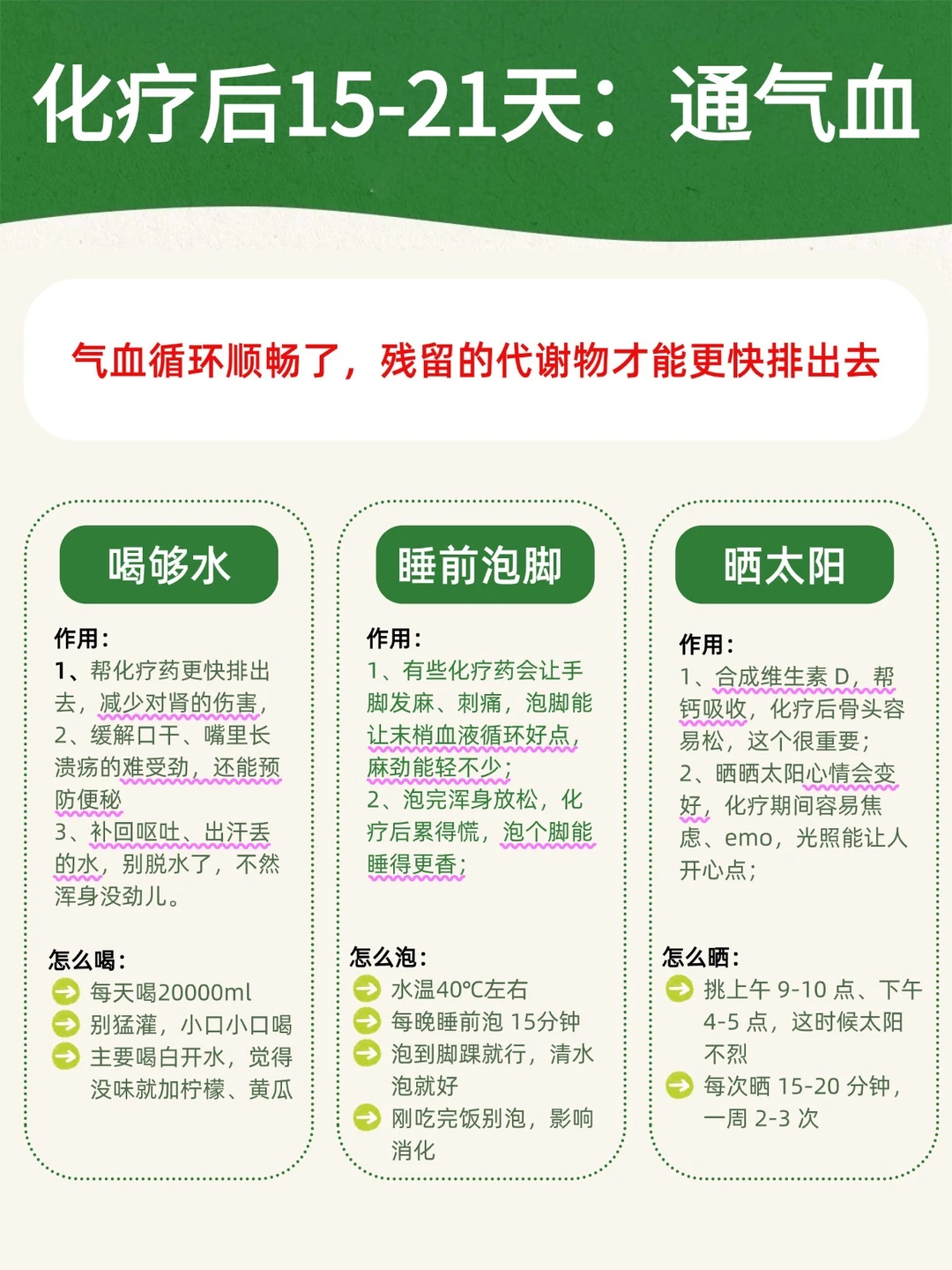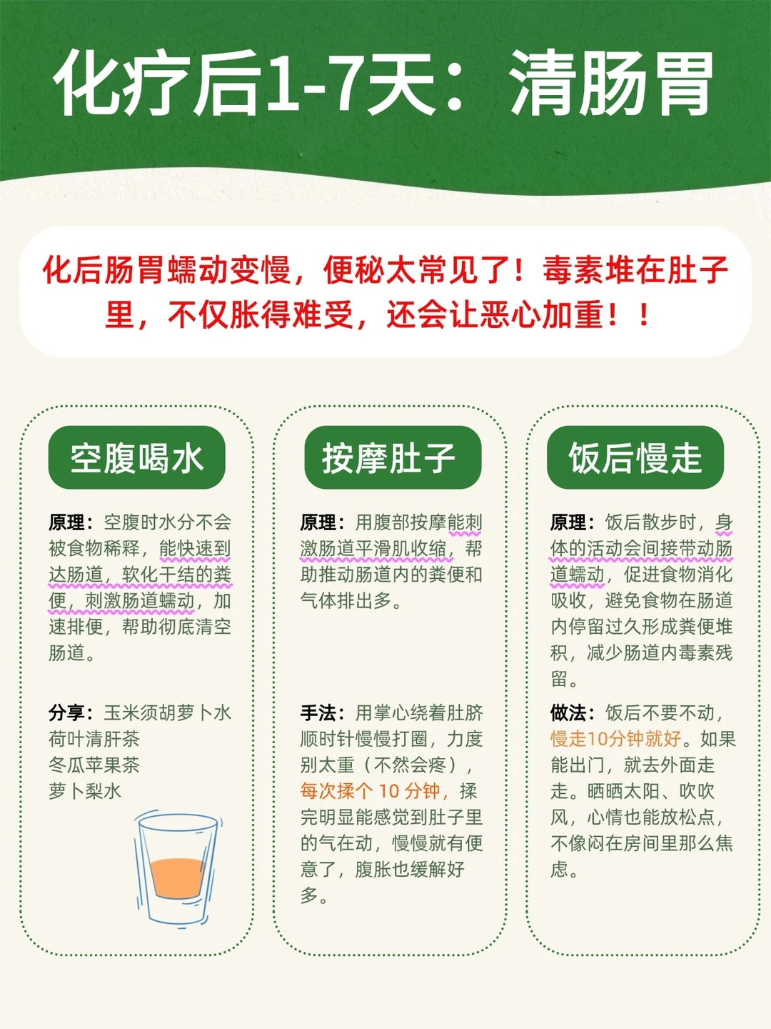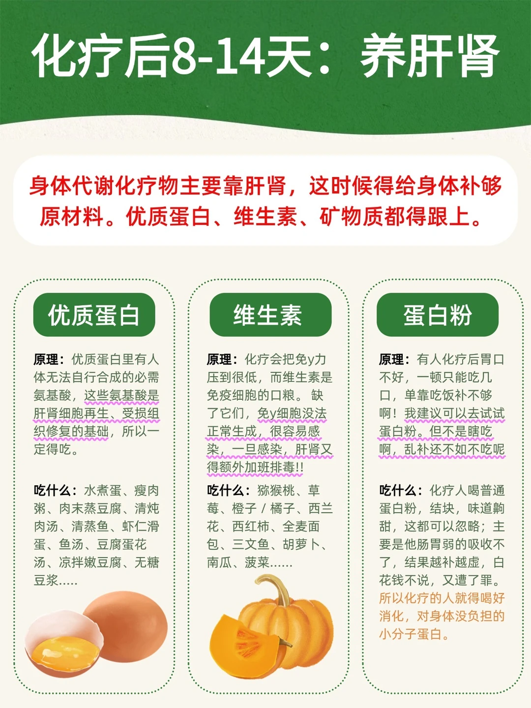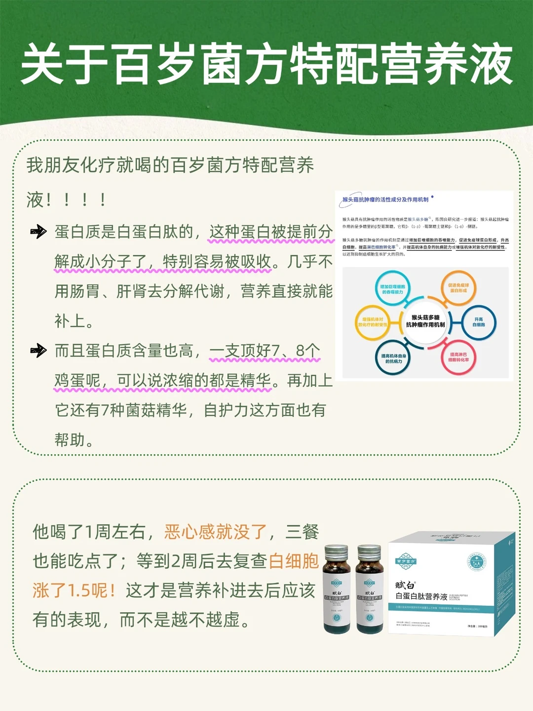 化疗的朋友应该都有同感:吃啥都反胃、浑身没劲像灌铅,连话都少了,都说化疗后得排毒,但不是瞎补,按阶段来调理,身体能恢复得快很多,今天分享一些办法,当个参考 - ❗化疗排毒分阶段,一步都别乱 1️⃣化疗后1-7天:清肠胃 化后肠胃蠕动变慢,便秘太常见了!毒素堆在肚子里,不仅胀得难受,还会让恶心加重。 ✅可以每天早上空腹喝一杯温水,再用掌心轻轻绕着肚脐揉5分钟,促进肠胃蠕动;饭后不要不动,靠墙慢走10分钟,促进消化。 . 2️⃣化疗后8-14天:养肝肾 身体代谢化疗物主要靠肝肾,这时候得给身体补够原材料。优质蛋白、维生素、矿物质都得跟上。再说了本身化后就是要补这些营养,咱这恢复、指标都指望他们呢! ✅清蒸鲈鱼、蒸蛋羹、西兰花炒虾仁都是好消化又有营养的。 但我朋友化疗后胃口不好,一顿只能吃几口,单靠吃饭补不够啊!听我的,我们的经验就是可以去试试蛋白粉。但不是瞎吃啊,乱补还不如不吃 👉他刚开始化疗就啥功课都不做,喝了普通蛋白粉。冲不开结块,味道齁甜,这都可以忽略;主要是他肠胃弱的吸收不了,再加上蛋白质这个东西代谢起来是真挺费劲的,化疗长期接触这些药物肝肾早就不堪重负了,这才越补越虚,肌酐也跟着涨,白花钱不说,又遭了罪。 . ✅遭了罪可算是知道改了,后面就换对肝肾没啥负担的小分子白蛋白肽了!蛋白粉也加价升级喝上液体的百岁菌方特配营养液了。 . 蛋白质含量虽然往下调了调,没人家那小一百的高,但起码能保证一个吃了全吸收,吃了没负担,补充效率还是杠杠的!再加上它还有7种菌菇精华,自护力这方面也有帮助。 . 他喝了1周左右,恶心感就没了,三餐也能吃点了;等到去复查白细胞涨了1.5呢!这才是营养补进去后应该有的表现,而不是越不越虚。 - 3️⃣化疗后15-21天:通气血 气血循环顺畅了,残留的代谢物才能更快排出去。 ✅每天保证喝够1800ml水,小口多次喝,别一次性猛灌;下午阳光好的时候,去楼下花园坐半小时,慢慢走一走,晒晒太阳补补钙;晚上睡前用生姜水泡脚,泡到小腿微微发热就行,泡完浑身都舒展,睡眠也变好了。 📍小tips ①化疗后尿色深、出汗多是正常排毒现象,不用慌,可煮点冬瓜薏米水喝,利水消肿 ②没力气别勉强运动,坐着做几组深呼吸、活动手腕脚腕也能促进循环