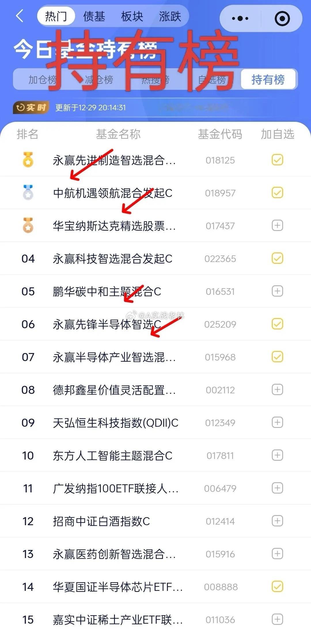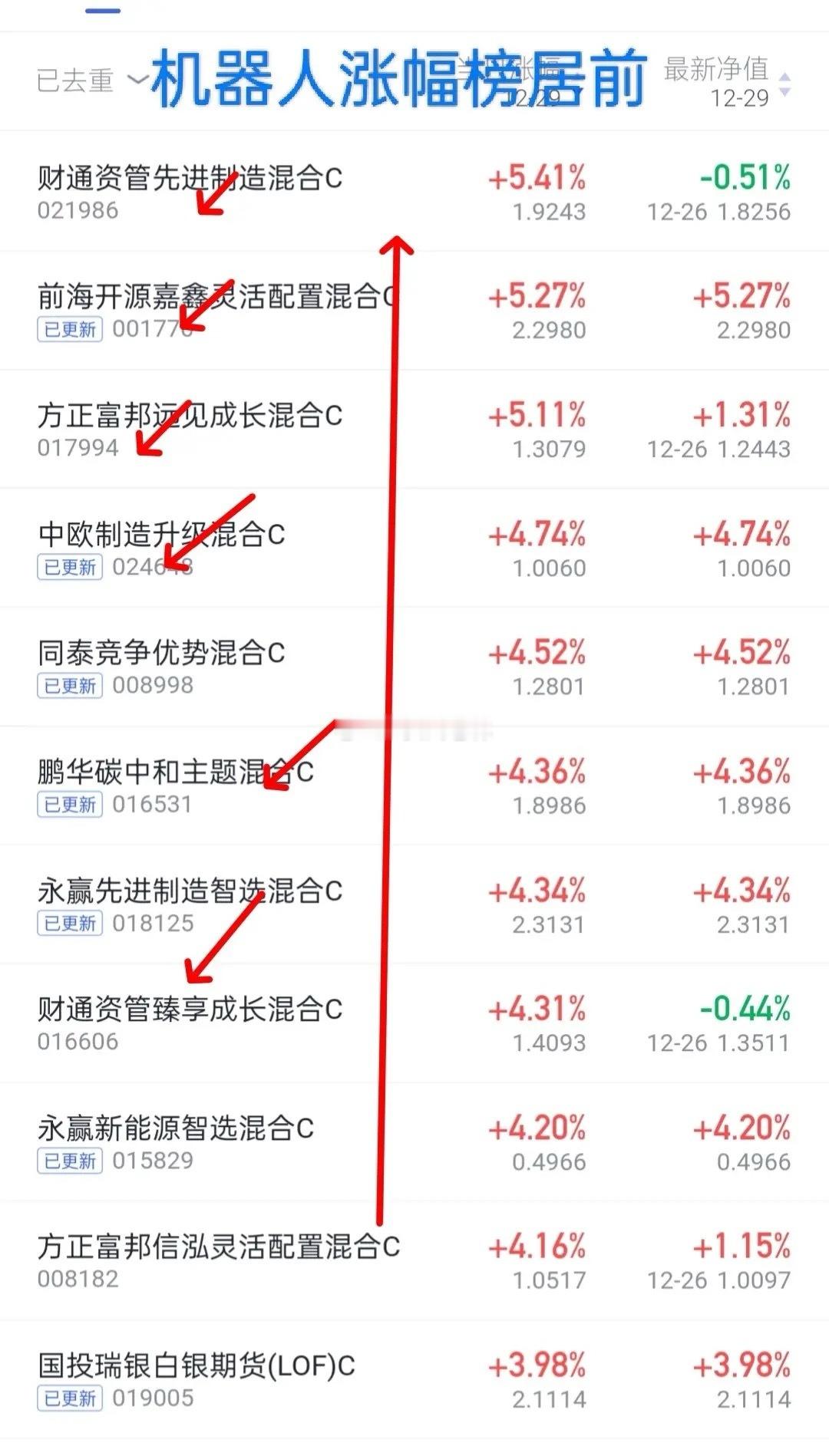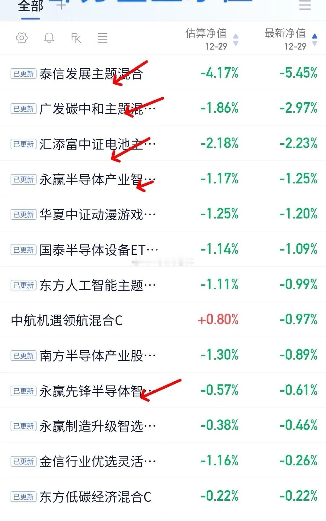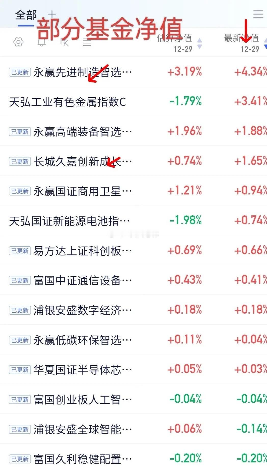 29日基金净值出炉,永赢机器人有惊喜。下图一二是部分基金净值,永赢机器人大涨4.34%,永赢先锋下跌0.6%,电池跌幅较大。 图三是今日基金持有榜,永赢机器人再次夺冠,中航机遇领航位居第二,永赢先锋半导体退居第六名。 图四是今日基金涨幅榜,机器人夺冠。 今天下跌比较大的板块就是锂电池,其次是有色金属板块。 年底两天,分歧加大,波动加大,有想减仓了结的,也有想进入赌跨年度行情的,我也想节前降低仓位,看最后两天行情如何?大涨大减仓,小涨小减,不涨不减。