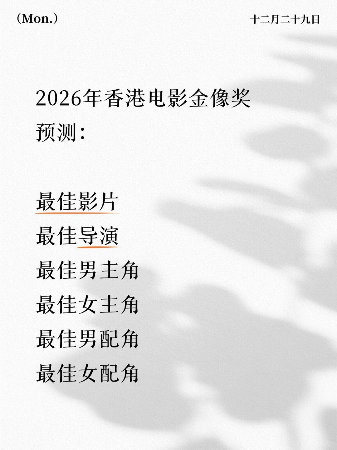 2026年香港电影金像奖预测最佳影片:《捕风追影》《像我这样的爱情》《今天应该很高兴》《女孩》《风林火山》《摇篮凡世》/《布米妈妈》最佳导演:《风林火山》麦浚龙《女孩》舒淇《布米妈妈》张吉安《捕风追影》杨子《今天应该很高兴》杨永光最佳男主角:《捕风追影》成龙《今天应该很高兴》《不赦之罪》hqs《内幕》《无名指》郭富城《金童》张继聪《恶人当道》姜皓文最佳女主角:《酱园弄悬案》章子怡《水饺皇后》马丽《像我这样的爱情》《摇篮凡世》廖子妤《不赦之罪》苏玉华《布米妈妈》胖冰最佳男配角:《水饺皇后》《摇篮凡世》袁富华《捕风追影》梁家辉《捕风追影》此沙《内幕》吴镇宇《送院途中》游学修最佳女配角:《水饺皇后》惠英红《酱园弄悬案》杨幂《摇篮凡世》许恩怡《今天应该很高兴》杨诗敏《无名指》鲍起静