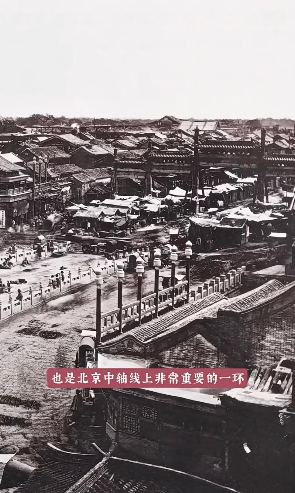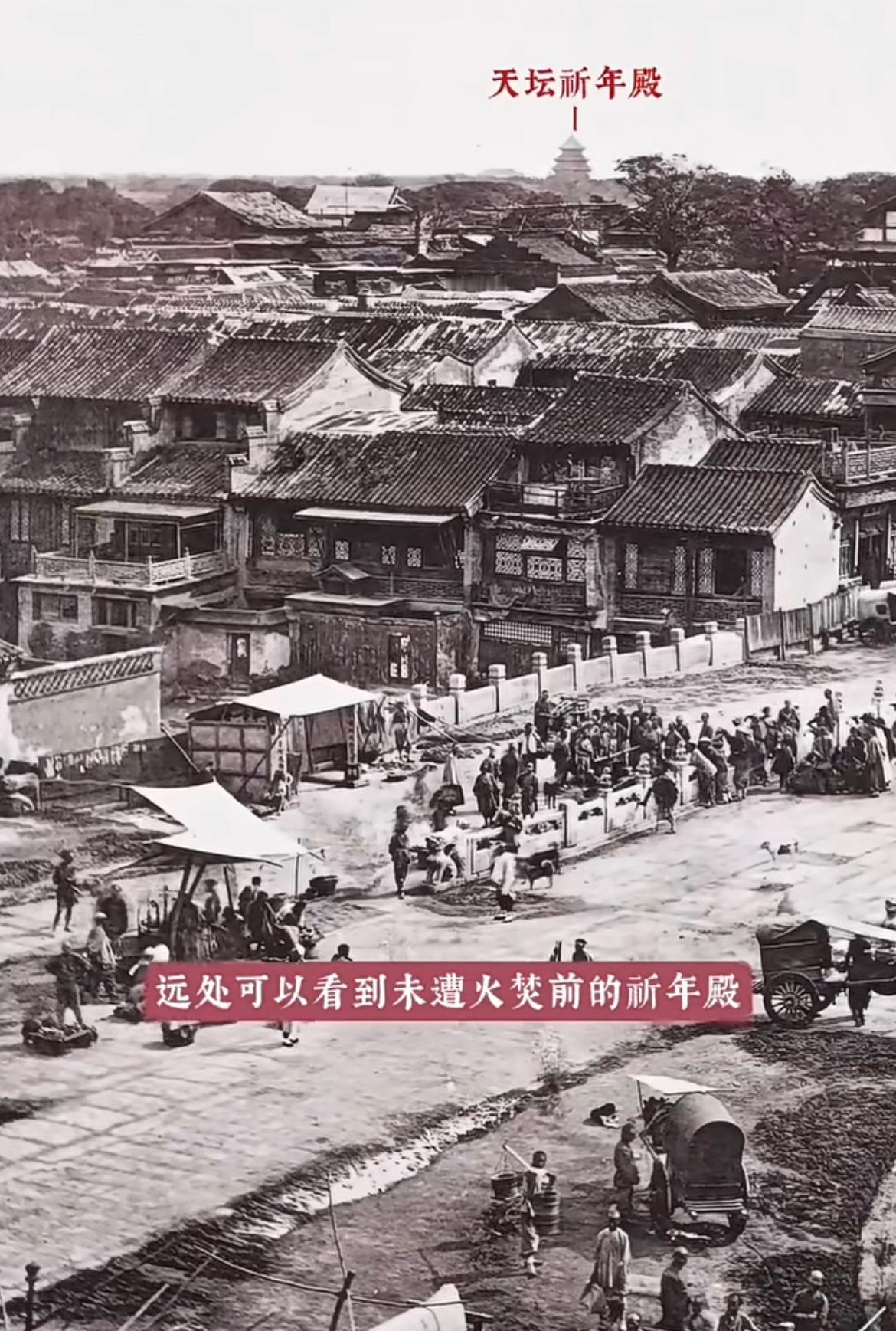 老照片:1871年(清朝同治十年),北京正阳门箭楼上拍摄的前门大街,远处可以看到未遭焚烧的天坛祈年殿,街道上占道严重,人群散乱,虽然不太美观,不过也算是很有生活气息了。 老照片 清朝