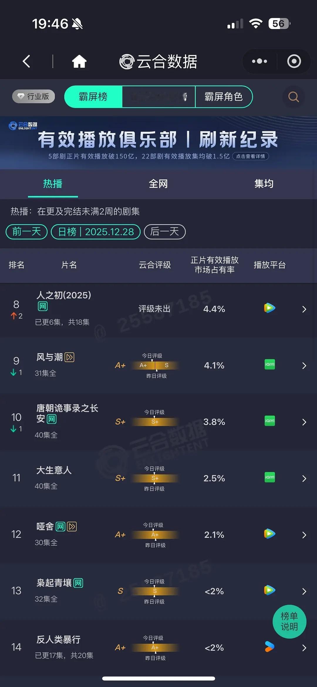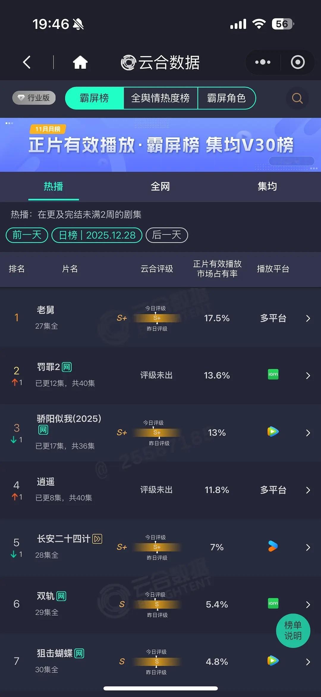 12.28云合老舅17.5%罚罪13.6%骄阳13%逍遥11.8%长安24计7