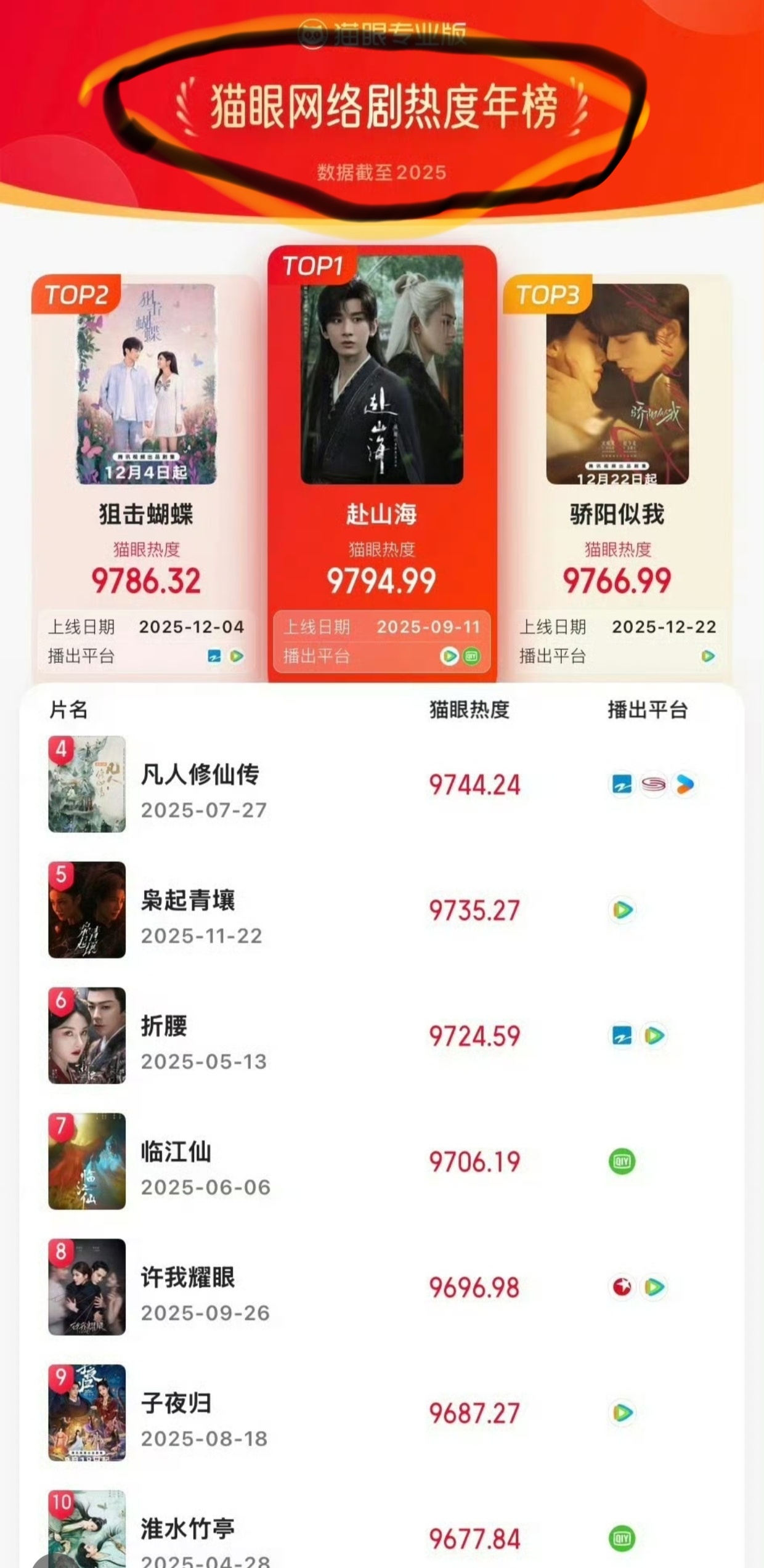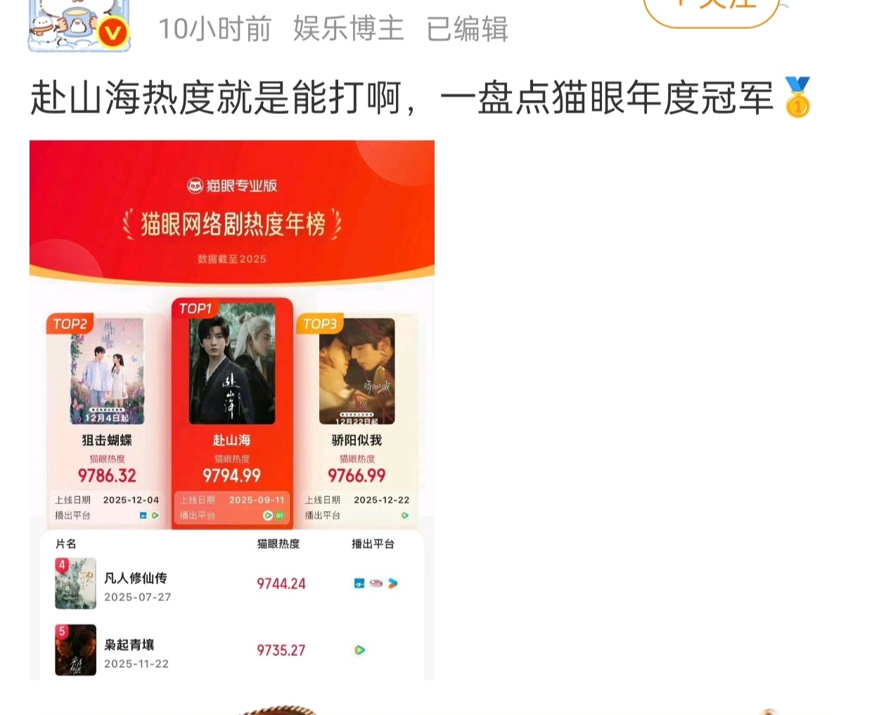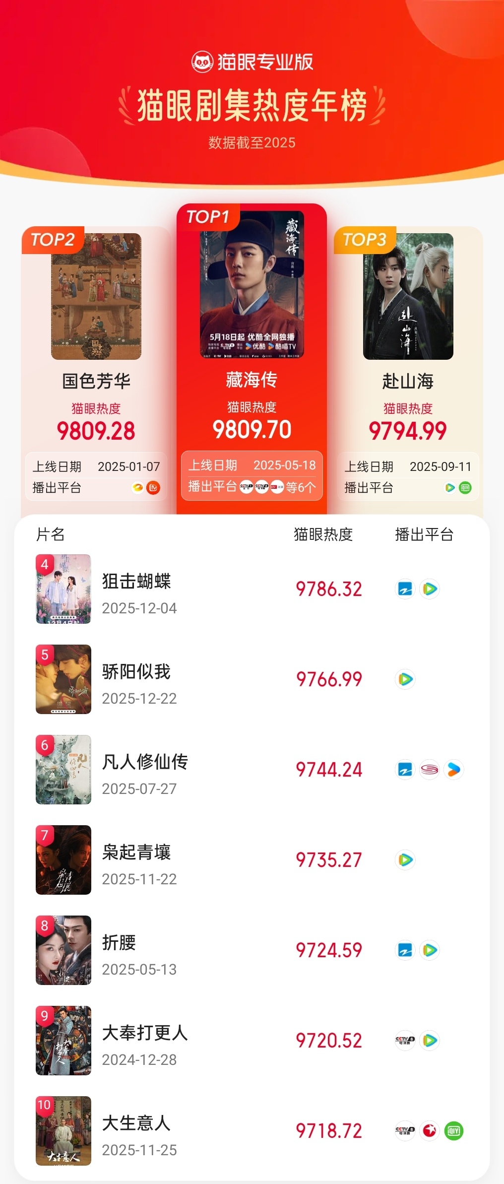 cy粉丝说赴山海是猫眼热度年度冠军懂了,开除上星剧《藏海传》《国色芳华》,就是第