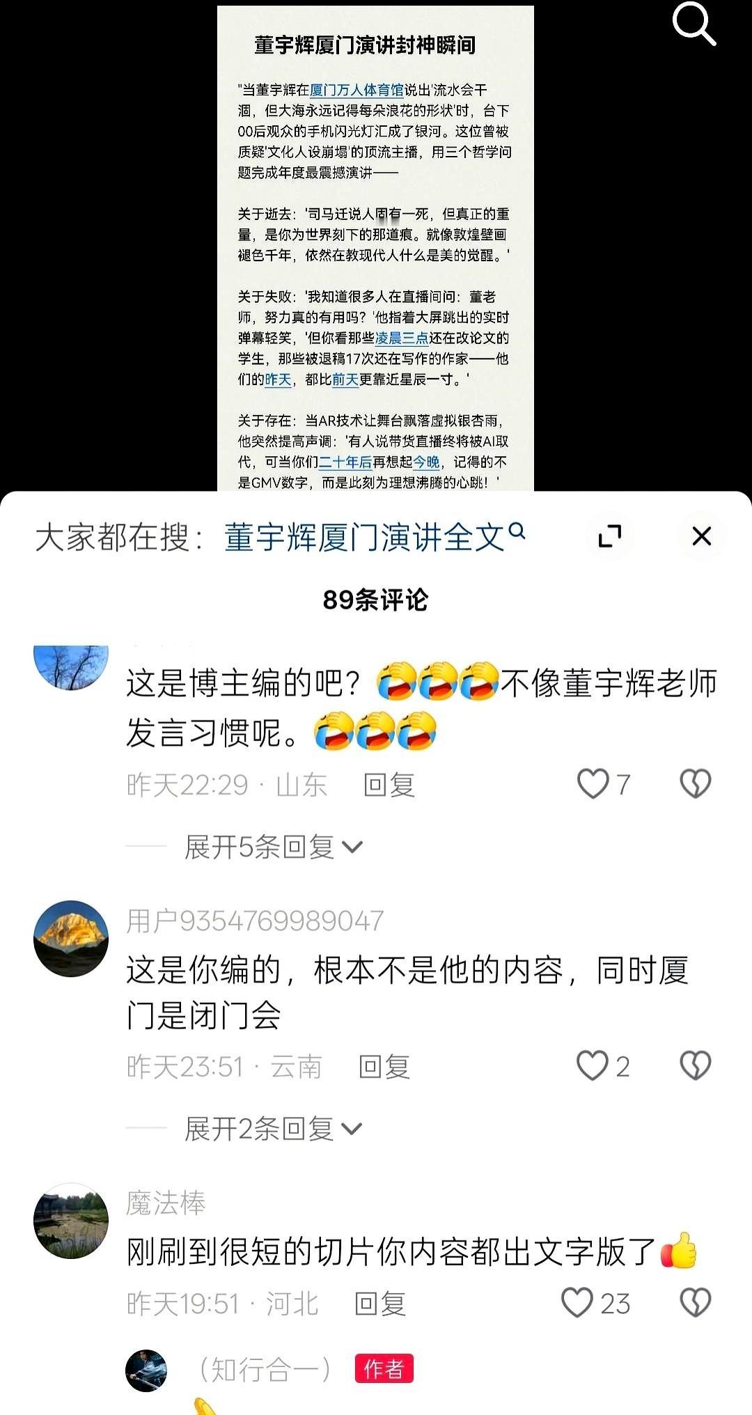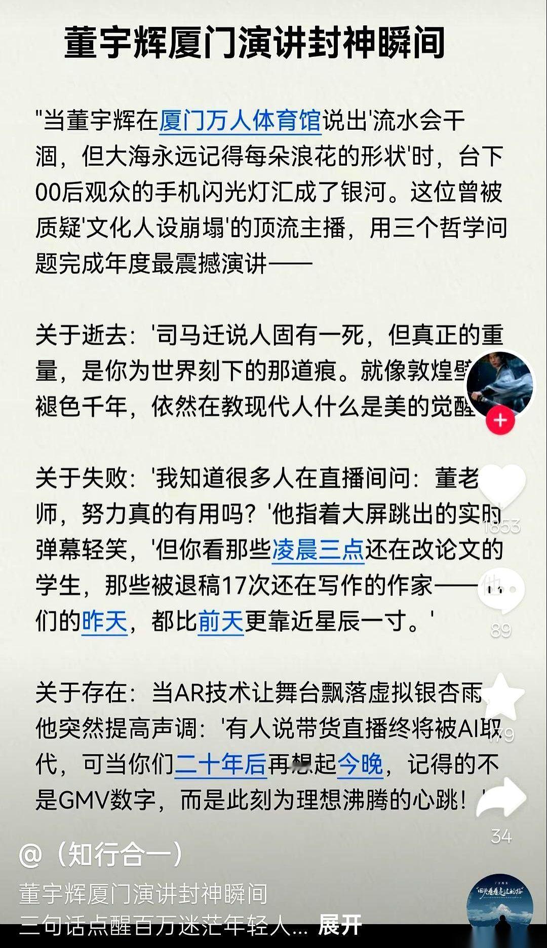 我真的,有时候会被一些事情给魔幻到。 董宇辉人在厦门一个酒店里,开个小范围的闭门会。 结果呢?在另一个人的平行宇宙里,他正在“厦门万人体育馆”激情澎湃地发表演讲。 演讲稿都给你安排得明明白白,一条一条的,金句频出。 我瞅了一眼,那味儿太冲了,一股子机翻味儿,浓浓的AI风。不知道的还以为是哪个实习生写的年终总结。 最离谱的是,真有朋友信了,大老远跑过去。 结果呢? 人早回北京了。连个影子都没看着。 你说这叫什么事儿? 这已经不是简单的“喜欢”了,这是一种“我以为的喜欢”。 自己心里先搭好一个“万人体育馆”的台子,然后非要把他按上去,让他按你写的剧本演。 他累,看的人也累。 说白了,就是把自己的想象,当成了事实。 有时候,真实比完美重要得多。 他就是个打工人,让他安安静静地做点事,比啥都强。 别用自己一厢情愿的“感动”,去绑架他的行程。 那不是爱,是负担。