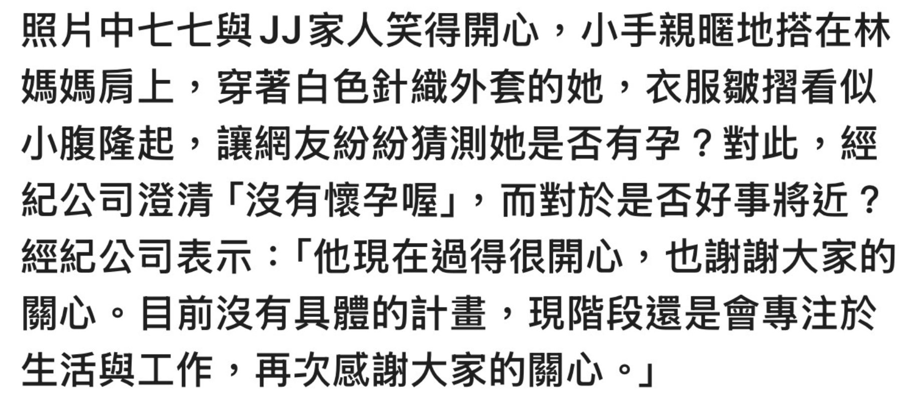 公司否认林俊杰女友怀孕林俊杰方否认女友怀孕 28日林俊杰官宣恋情 ,网友猜测合照中女友七七有孕相。刚刚,经纪公司回应称:“没有怀孕。”并表示林俊杰现在过得很开心,也谢谢大家的关心。“目前没有具体的计划,现阶段还是会专注于生活与工作。”