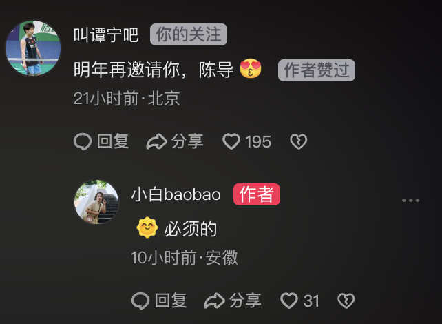 陈清晨dy更新:羽超联赛结束啦! 新身份新体验 短暂的成为“陈导”的一个月 希望你们未来球技越来越棒 冲向顶峰✌🏻羽超联赛