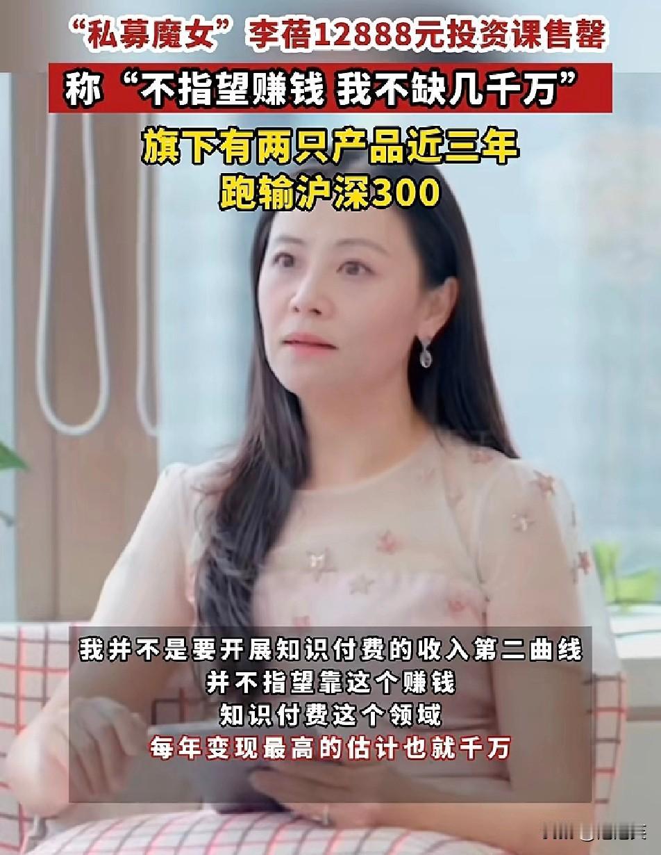太敢说! “私募魔女”李蓓的操作 直接看呆网友! 她推出的12888元投资课刚上线,200个名额就瞬间售罄 可她却公开表示“不指望靠这个赚钱,我不缺几千万” 更让人意外的是,她旗下有两只产品近三年跑输沪深300 作为国内首位百亿私募女掌门 李蓓的这番言论被网友解读为“大佬的格局” 但也有人质疑“产品业绩没跑赢指数,高价课的价值在哪?” 你觉得这堂万元投资课值不值得买? 是大佬的真心分享,还是另一种流量变现的方式?