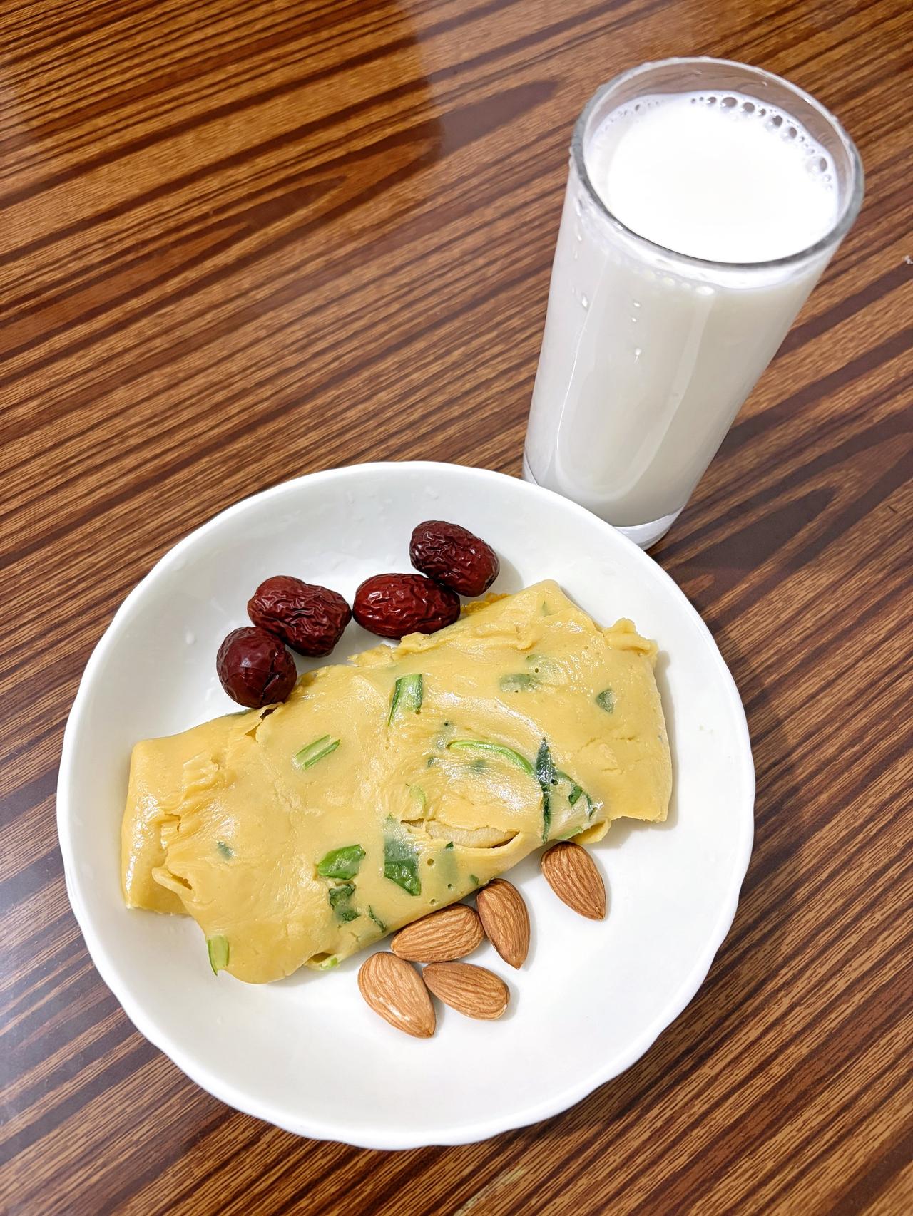 今日减脂早餐:鸡蛋蔬菜饼+红枣+坚果+牛奶