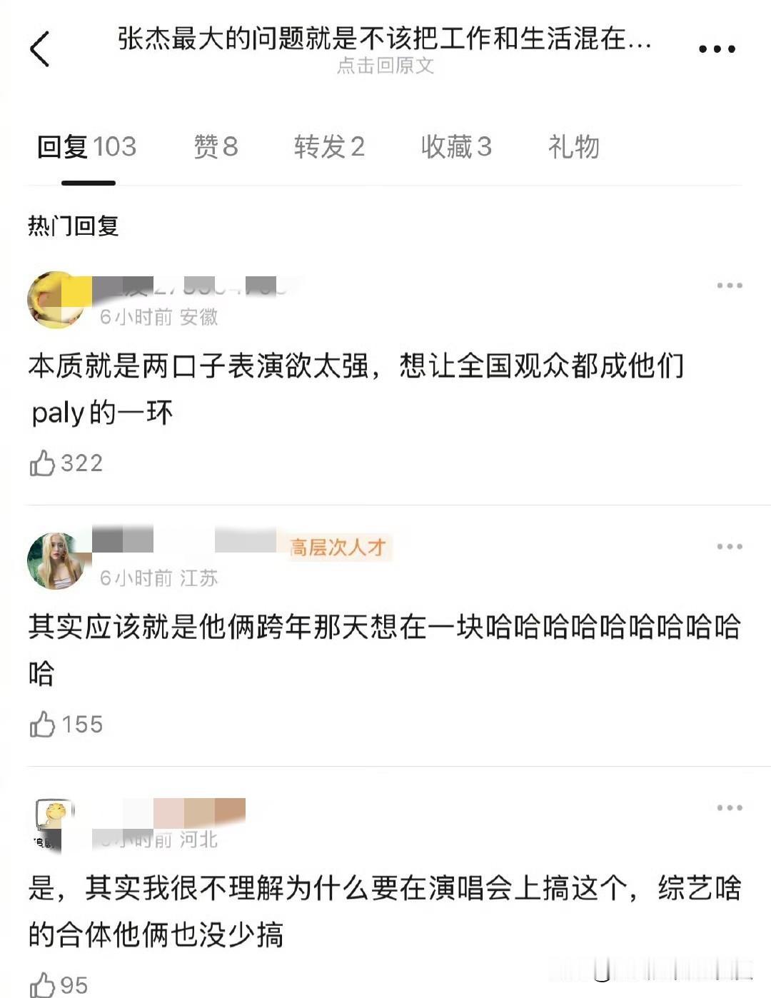 张杰演唱会请谢娜,小沈阳演唱会请他闺女,本质都是一样,「公器私用」 演唱会是商业性质的,能买票进去的,都是真爱忠粉。 谁愿意花钱看喜欢的人,和他爱的人各种秀? 你在家,在微博怎么秀都好说,毕竟是自己的地方,演唱会是为观众服务的。 试想一下,段奕宏,张译,朱亚文这些叔圈天菜们,带着老婆在剧里演吻戏,粉丝会接受吗? 人家工作和生活都分得很清楚。 张杰和谢娜一直以来,都特喜欢在舞台上秀恩爱,确实挺难评。