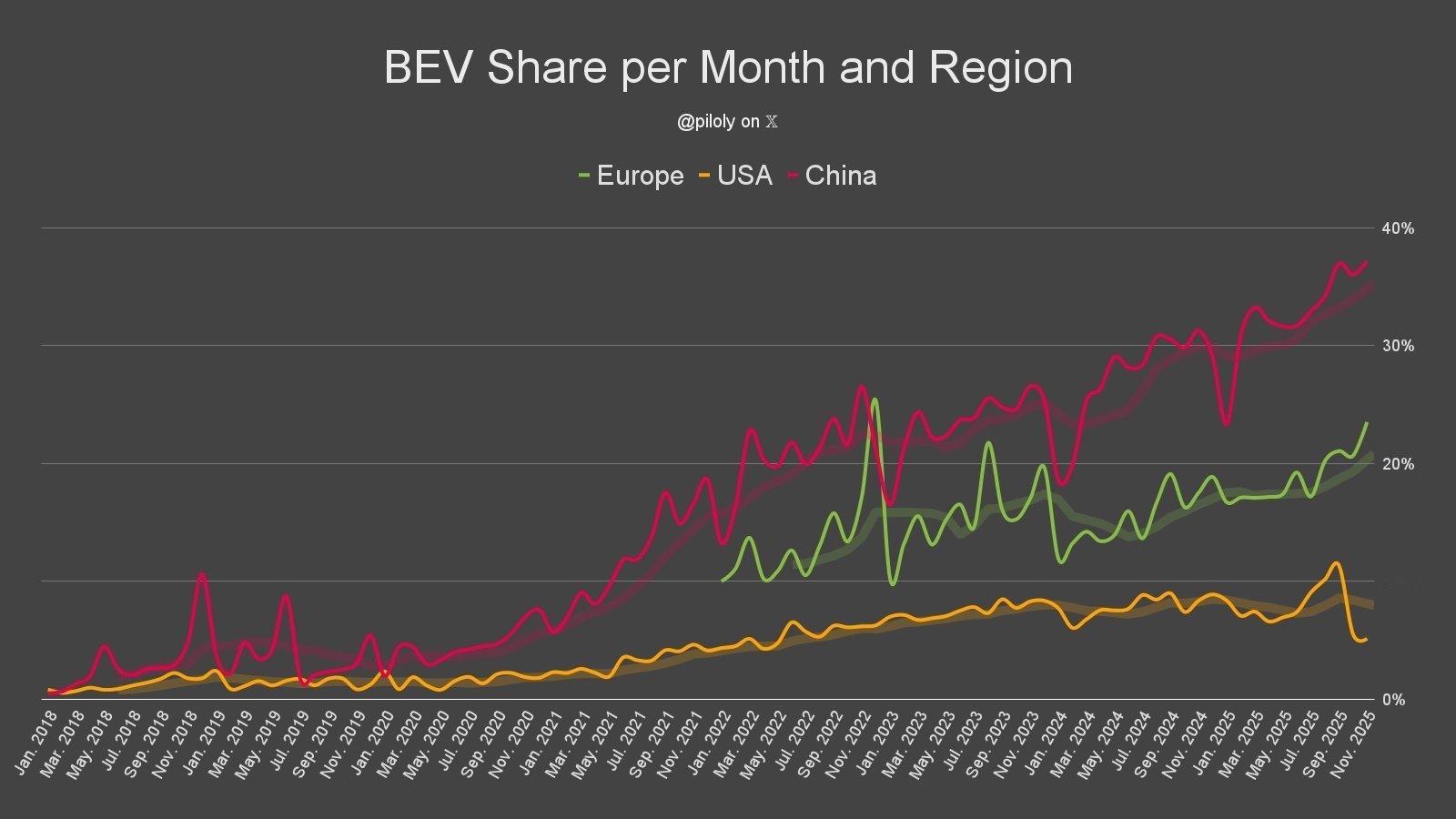 美国这边的BEV占比,确实有点让人唏嘘。9 月补贴一停,11 月的电动车渗透率直接跌回 2022 年 6 月以来最低。对比之下就很明显了,中国在加速拥抱电动车,欧洲整体趋势也还算稳。同样是转型,有的在踩油门,有的却松了刹车。电车出海大v聊车美国纯电车