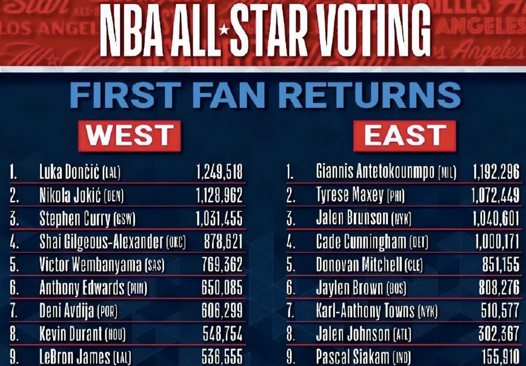 NBA常规赛继续展开,过去一夜场外则又传来3大消息,其中联盟公布上周最佳球员,西部莱昂纳德无悬念当选,东部则是杰伦-布朗;最新实力榜上,快船凭借着一波4连胜也是连升5位;NBA官方还公布了全明星首轮球迷投票结果,东契奇成为票王,字母哥则是东部第一。 NBA官方宣布,杰伦·布朗与小卡分列上周东西部最佳球员。这当中西部的竞争最为激烈,毕竟上一周约基奇的数据也很恐怖,不过莱昂纳德这边也是非常强势,场均拿到41.3分9.0篮板2.7抢断,投篮命中率58%,三分命中率50%,罚球命中率97.1%,带领快船取得3胜0负的成绩,这也是他本赛季首次当选,快船生涯第5次。 NBA官方公布最新一期的球队战力榜,三杀雷霆的马刺连升4位来到榜首,卫冕冠军则首次跌至第二,湖人这边则从第七跌至第九。而下面的球队,快船势头很猛,连升5位来到第22位,近期也是取得了一波4连胜,球队士气也是高涨。虽说快船目前战绩只有10胜21负,还排在西部倒数第三,但外界已经看到了他们崛起的苗头。 2026年NBA全明星球迷投票首轮结果出炉,东契奇领跑全联盟(票王),字母哥东部第一。而作为联盟老牌球星的代表,库里拿到100多万票,排在西部第三;杜兰特则以差不多55万票排在西部第八,詹姆斯则以差不多54万票仅排在西部第九。东道主的哈登则只有21.5万票排在西部第12位,莱昂纳德只排在第20。 从这也可以看出,联盟已经开始被年轻球员顶替,东部这边字母哥、马克西、布伦森、康宁汉姆和米切尔领衔,杰伦-布朗和唐斯紧随其后,首发五人大概率会在这几人中产生。西部这边悬念似乎不大,首发五人大概率就是东契奇、约基奇、库里、亚历山大和文班亚马,他们的票数也是遥遥领先,詹姆斯这边想要入选首发的难度还是非常之大。