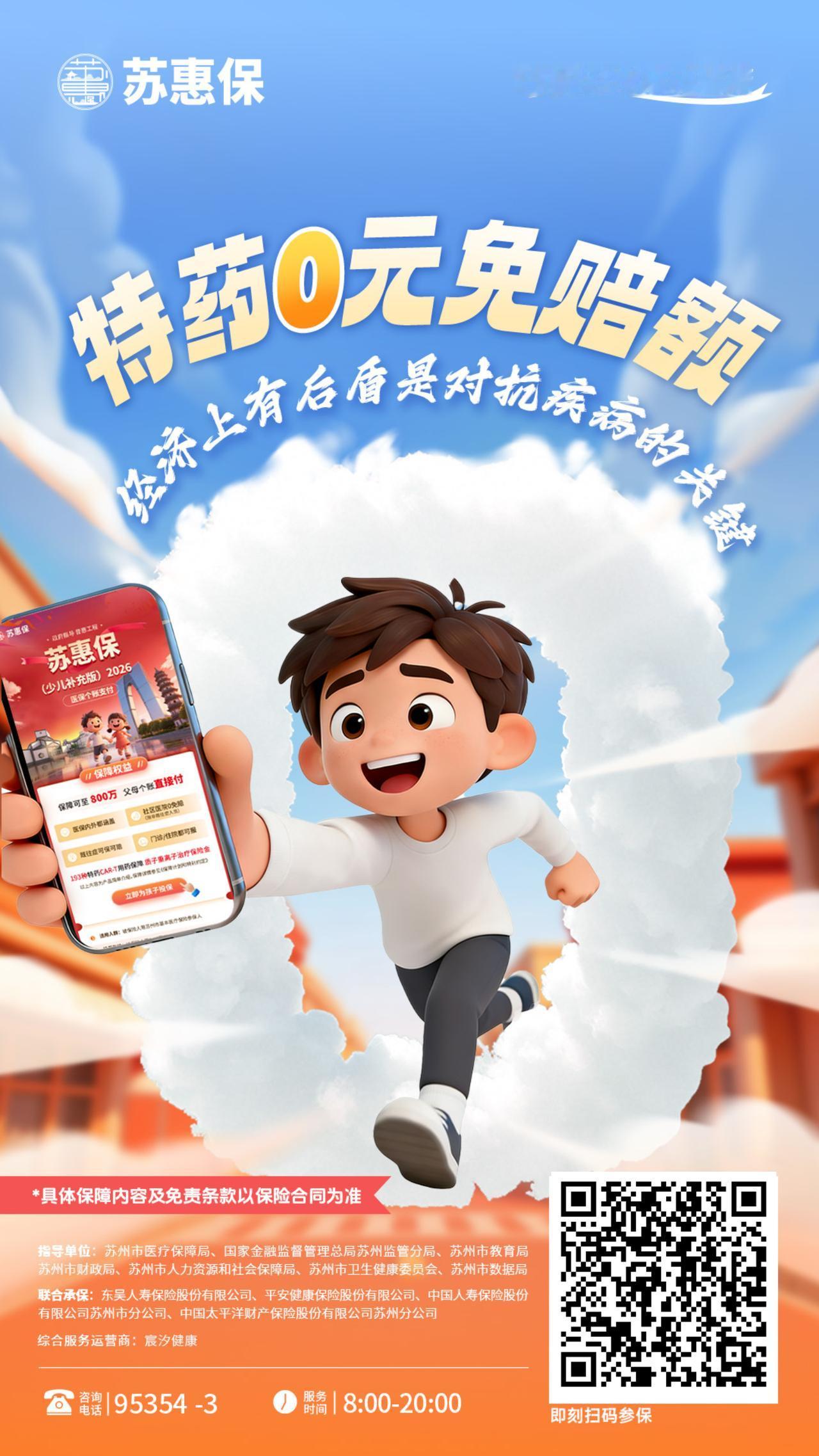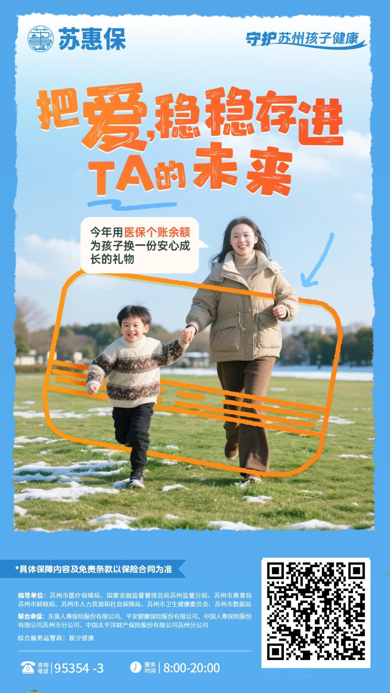 孩子的健康成长是一个家庭的头等大事,由苏州市医疗保障局等七部门联合指导,东吴人寿、平安健康等四大险企联合承保的苏惠保(少儿补充版)2026正式暖心上线,为 0-17 周岁苏州医保参保少年儿童筑牢健康防护网! 这款专属少儿补充医保亮点十足,保障力度拉满!总保额高达 800 万元,涵盖四大核心保障:200 万元门急诊及住院医疗保险金、200 万元特定疾病门急诊及住院医疗保险金、200 万元包含 CAR-T 在内的恶性肿瘤特定药品费用保险金,以及 200 万元质子重离子治疗保险金。医保内外的药品、检查、治疗费用全面覆盖,门诊住院皆可报,无论是日常小病痛还是重大疾病治疗,都能提供有力的费用支撑。 更令人省心的是产品的五大惠民亮点:职工医保个账余额可直接划扣保费,无需额外现金支出,缴费便捷高效;医保定点社区医院就医 0 免赔额,报销门槛低,大大减轻家庭就医负担;不限健康状况,既往症人群也可保可赔,让每个孩子都能获得保障机会;保障责任覆盖全场景,从普通门诊到重大疾病特疗,全方位守护未成年人健康。值得一提的是,产品无等待期,投保后即刻生效,保障期限长达一年,让家长更安心。 目前参保通道已正式开启,投保截止日期为 12 月 31 日,错过再等一年!为孩子添置一份坚实的健康保障,让成长之路少一份顾虑、多一份安心。赶紧为 0-17 周岁的苏州医保参保少年儿童办理参保,用一顿饭的花费,锁定 800 万的全面守护,给孩子满满安全感!