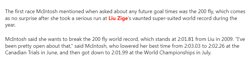 麦金托什说:“我对此持开放态度。”她在2025年6月的加拿大选拔赛中将自己200米蝶泳的最好成绩从2:03.03提升至2:02.26,随后在7月的世锦赛上再度刷新PB,将最好成绩提升至2:01.99。她也成为刘子歌后第二位在200米蝶泳项目中突破2分02秒的大关女运动员。