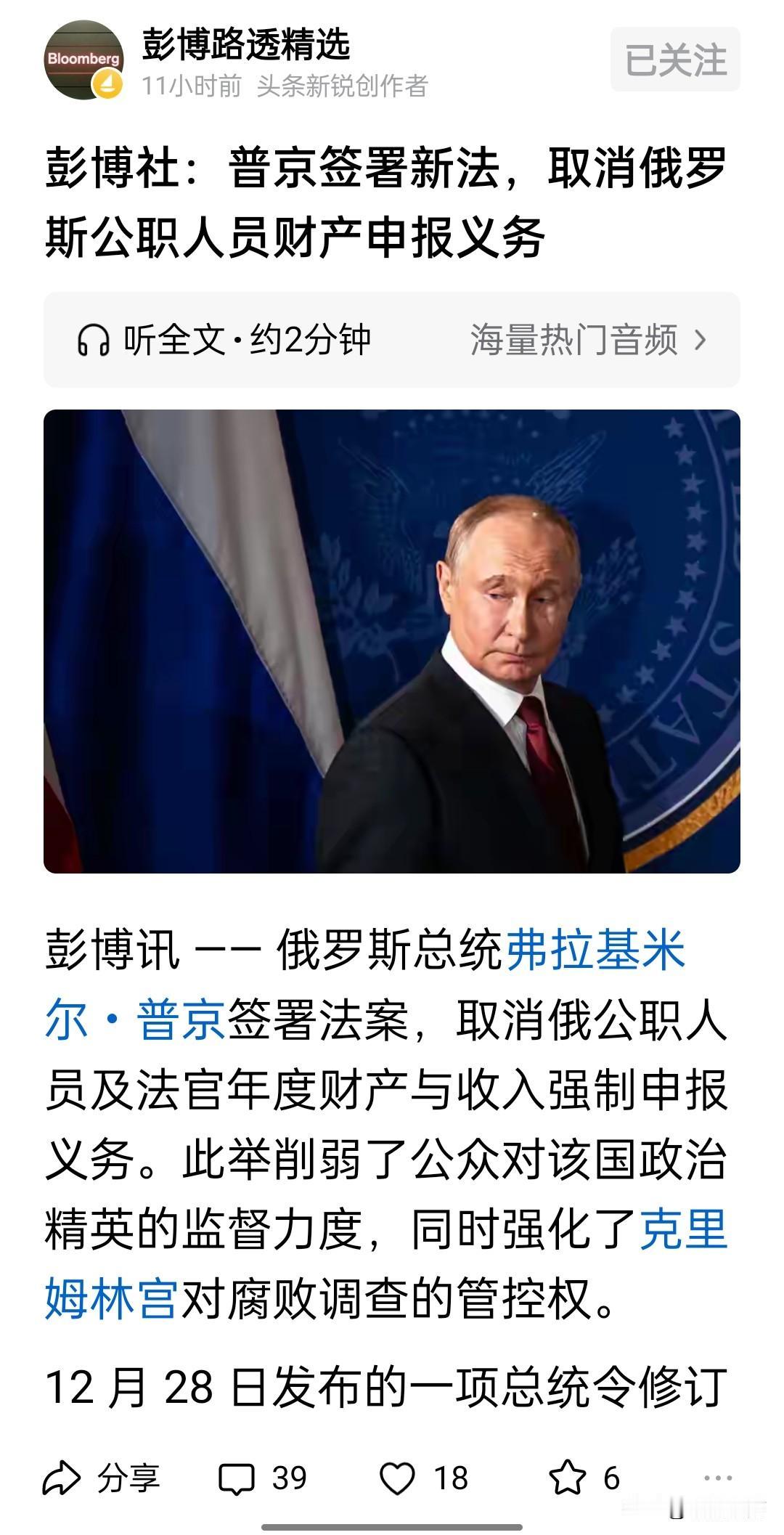 据彭博社消息,俄罗斯立法取消公职人员财产申报义务。有不少网友评论这是普京为了换取公务人员的支持,我好奇的是他们要怎么向民众解释这项法令的合理性与必要性,或者说无需解释? 二战以来,各国政府权力运行更加阳光透明应该是大势所趋,这样以法律形式回归传统还比较少见,逆大势而动,用常用语来说,应该就是“反动”吧?[笑哭]俄罗斯政策 俄罗斯法案