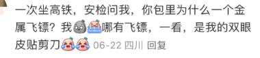 一次坐高铁,安检问我,你包里为什么一个金属飞镖?我哪有飞镖,一看,是我的双眼皮贴剪刀