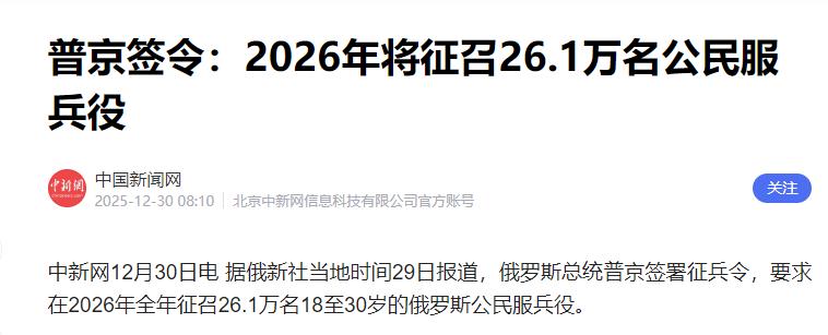 俄罗斯总统普京签署命令! 12月29日,俄罗斯总统普京签署命令,要求在2026年全年征召26.1万名18至30岁的俄罗斯公民服兵役。明令规定被征召人员将分两阶段,即2026年4月1日至7月15日及10月1日至12月31日期间集中前往服役地点。 这数字看着比去年少点,但根本不算降温,2025年俄罗斯的常规征兵是分春秋两季推进的,春季计划征召16万人,秋季则是13.5万人,全年加起来足足有29.5万。 这么一比,2026年的26.1万确实少了3.4万,但要知道俄罗斯的兵力补充从来不是只靠义务征兵这一条腿,根据俄联邦安全会议副主席梅德韦杰夫12月24日的披露,2025年俄罗斯已经招募了41.7万名合同军人,还有3.6万名公民自愿参军。 这意味着常规义务兵只是兵力补充的“基本盘”,真正支撑前线作战和兵力规模的,是合同兵与志愿兵群体,26.1万的义务征兵数,更像是维持军队正常轮换的“保底操作”,而非决定军事力度的核心指标。 再看俄罗斯的长期扩军目标,就更能理解这26.1万的深意,早在2024年,普京就已下令要求军方到2026年将现役人员规模提升至150万人,而根据现有数据,截至2025年9月,俄罗斯现役军事人员已经增至189万,总兵力更是达到了315万。 这说明当前的征兵工作,早已不是“填补缺口”,而是“巩固规模、优化结构”,2026年的26.1万征兵令,本质上是为了维持这种庞大兵力规模的常态化补充——毕竟军队有正常的退役轮换,每年都需要新鲜血液接入,26.1万的数字刚好能匹配这种轮换需求,何来“降温”之说? 何况,就在征兵令签署前两天,12月27日普京还身着军装亲临俄军联合指挥部召开紧急作战会议,听取前线战况汇报,甚至直接划定红线:若西方“志愿联盟”军队进入乌克兰,将直接成为俄军合法打击目标,这种“戎装临阵”的姿态,比任何数字都更能说明问题——如果真要降温,何必在前线指挥层面保持如此强硬的姿态? 从战场态势来看,截至12月30日,俄军仍在库皮扬斯克、顿涅茨克、扎波罗热等多个方向保持攻势,单日交战次数最高达到103次,俄军在部分方向的累计伤亡已超20万人,如此高强度的战场消耗,必然需要持续的兵力补给,2026年的征兵分4-7月、10-12月两阶段推进,刚好能衔接前线的兵力轮换周期,这分明是精准匹配作战需求的安排,而非收缩信号。 说到底,判断俄罗斯军事政策是否降温,不能只盯着义务征兵的单一数字做文章,更要结合其整体兵力规模、战场态势和长期战略目标,26.1万的征兵令,看似比2025年的29.5万少了一点,但放在315万的总兵力盘子里,放在持续激战的前线需求中,放在150万现役规模的目标框架下,根本算不上什么“降温”,顶多是常规操作的微调。 对于乌克兰和西方而言,与其期待俄罗斯“降温”,不如正视俄罗斯已将经济全面转向战时轨道的现实,毕竟当一个国家愿意持续投入资源维持百万级兵力规模时,所谓的“降温”从来都只是一厢情愿的幻想,未来一年随着这26.1万新兵完成训练补入军队,俄乌冲突大概率还会维持当前的高强度对峙态势,所谓的“和平曙光”恐怕还远未到来。